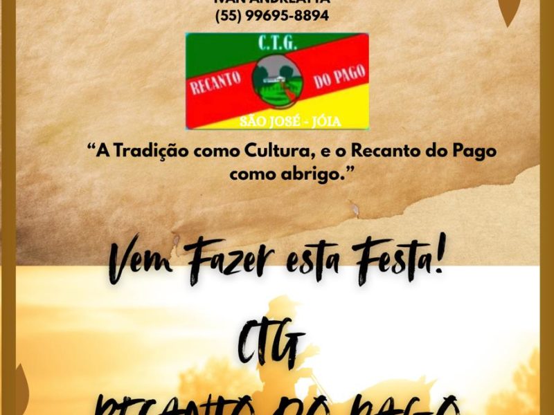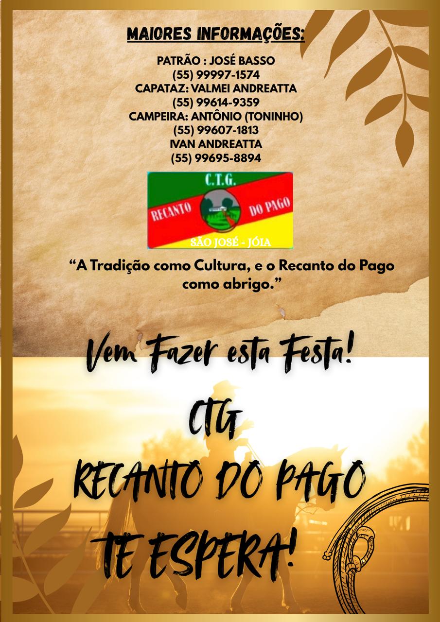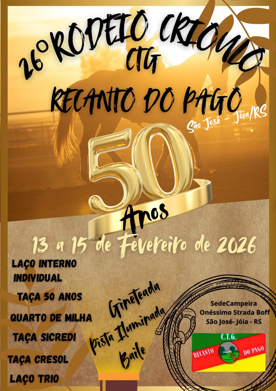 O município de Jóia recebe, de 13 a 15 de fevereiro, o 26º Rodeio Crioulo do CTG Recanto do Pago, em comemoração aos 50 anos da entidade. O evento ocorre na sede campeira do CTG, na localidade de São José, e reúne competições campeiras, gineteada e baile.