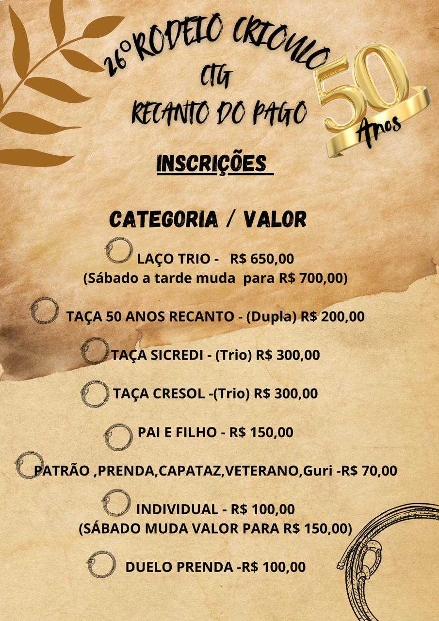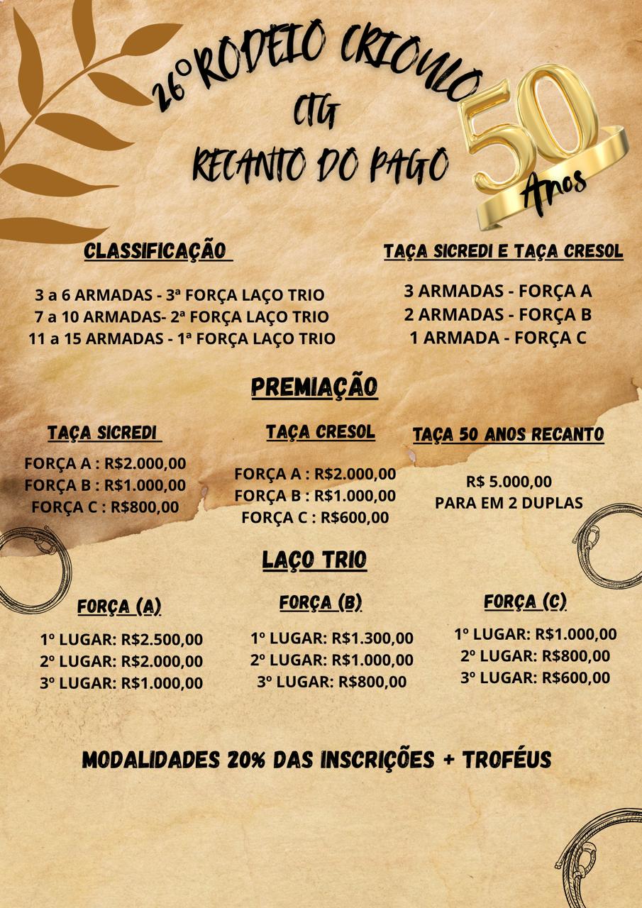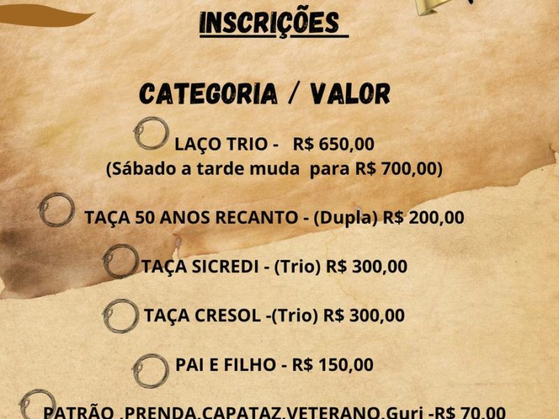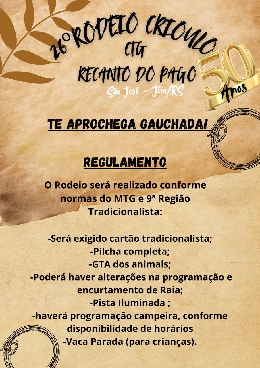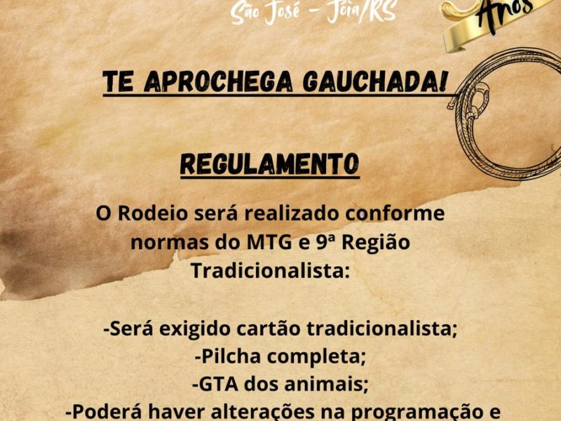 O rodeio será realizado conforme as normas do Movimento Tradicionalista Gaúcho (MTG) e da 9ª Região Tradicionalista. Mais informações podem ser obtidas pelo contato em anexo.
