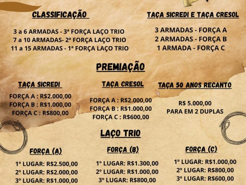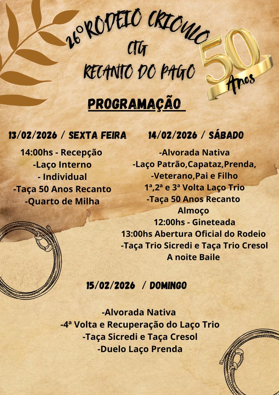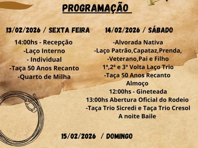 A programação inicia na sexta-feira, dia 13, com recepção, laço interno, provas individuais, Taça 50 Anos Recanto e quarto de milha. No sábado, dia 14, estão previstas a Alvorada Nativa, provas de laço patrão, capataz, prenda, veterano e pai e filho, além das voltas do laço trio, gineteada, abertura oficial do rodeio, disputas da Taça Trio Sicredi e Taça Trio Cresol e baile à noite. No domingo, dia 15, ocorrem a Alvorada Nativa, a quarta volta e recuperação do laço trio, provas das Taças Sicredi e Cresol e o duelo de laço prenda.