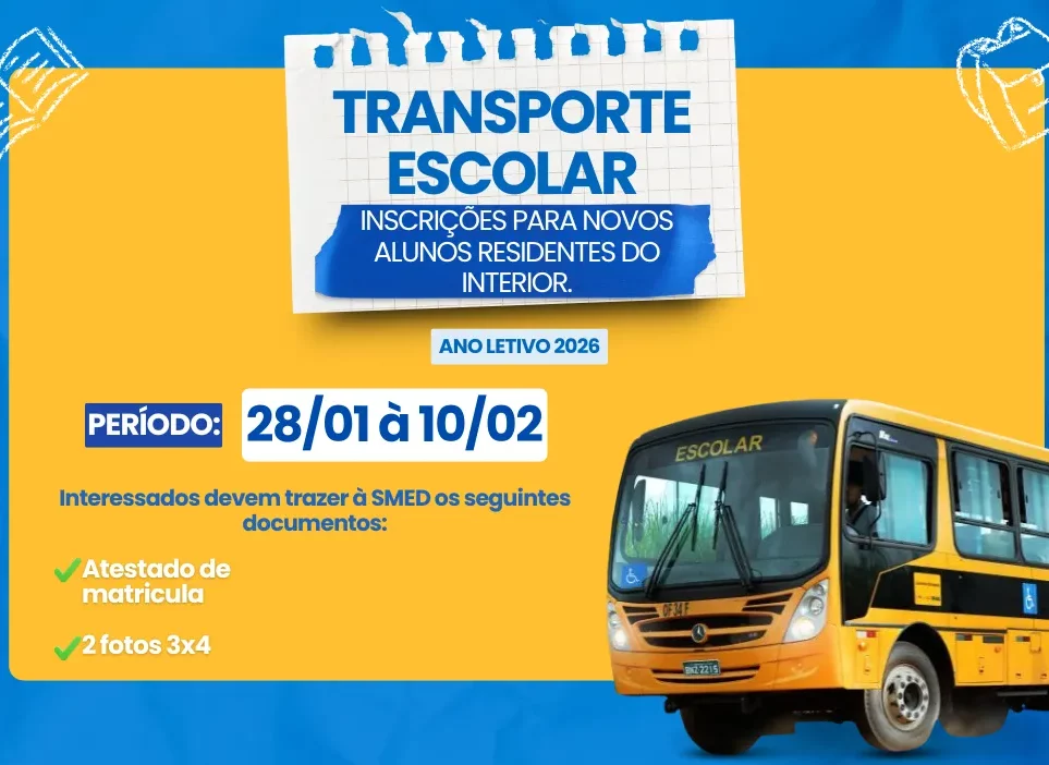 Já os alunos veteranos que permanecem na mesma instituição de ensino não precisam comparecer à Secretaria. O recadastramento para este grupo será automático, realizado diretamente pelas escolas, que encaminharão os atestados de matrícula à SMEd. A orientação da secretaria é que as famílias se organizem com antecedência para evitar a perda do prazo e assegurar o transporte logo no início das aulas.