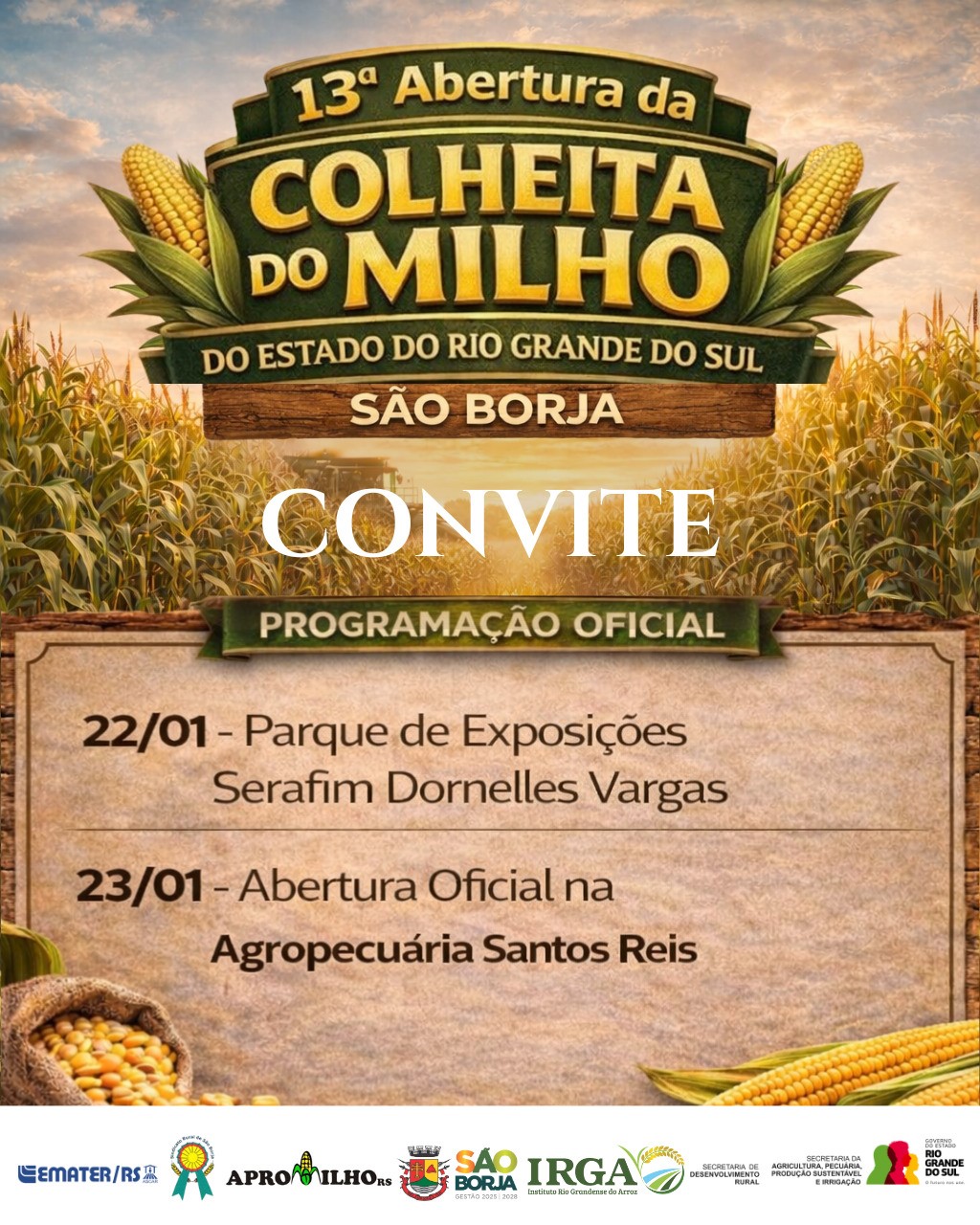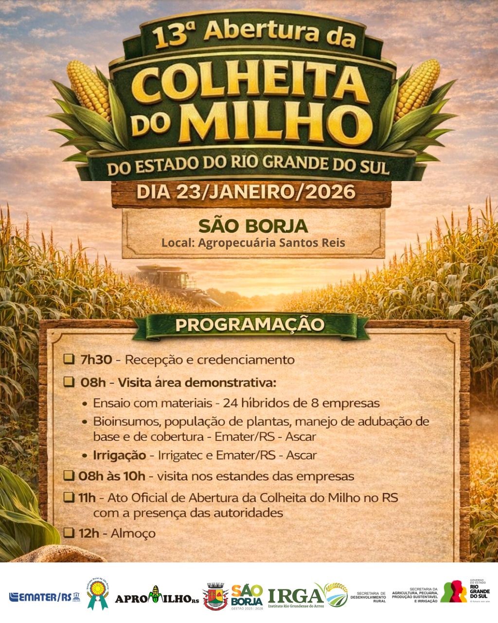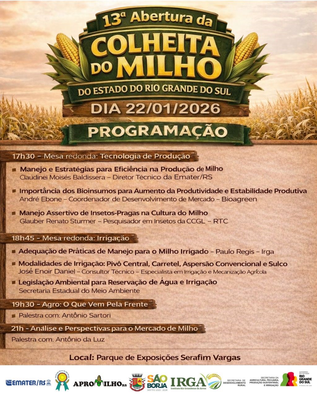 Hoje e amanhã, o município de São Borja vai sediar a 13ª Abertura da Colheita do milho no Rio Grande do Sul. Além do ato de abertura da colheita, a programação vai contar com divulgação de tecnologias e sementes, ações de mercado e técnicas de manejo. Empresas estarão presentes.