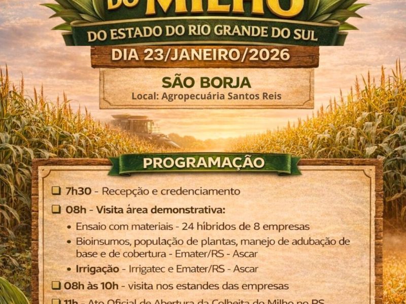 Já o momento de abertura da colheita do milho no Estado vai ocorrer amanhã, na agropecuária Santos Reis, de São Borja. As 8 horas, haverá visita a área demonstrativa com ensaio de 24 híbridos de milho de oito empresas, ainda demonstração sobre bioensumos, população de plantas e manejo de adubação. Após, vai ter momento de visita a estandes de empresas, com o ato de abertura da colheita de milho as 11 horas.