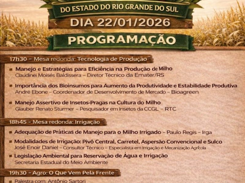 Hoje, as 17 horas e 30 minutos, no parque de exposições Serafim Vargas, haverá mesa redonda sobre manejo e estratégia para eficiência na produção de milho, importância de bioensumos, também manejo de pragas e insetos. Logo após, as 18 e 45, vai ser a vez de mesa redonda para debater irrigação, com adequações de práticas, modalidades de irrigação e legislação ambiental. Outro destaque de hoje vai ser a palestra com o economista da Farsul, Antônio da Luz, que vai fazer análise e perspectiva para o mercado de milho.