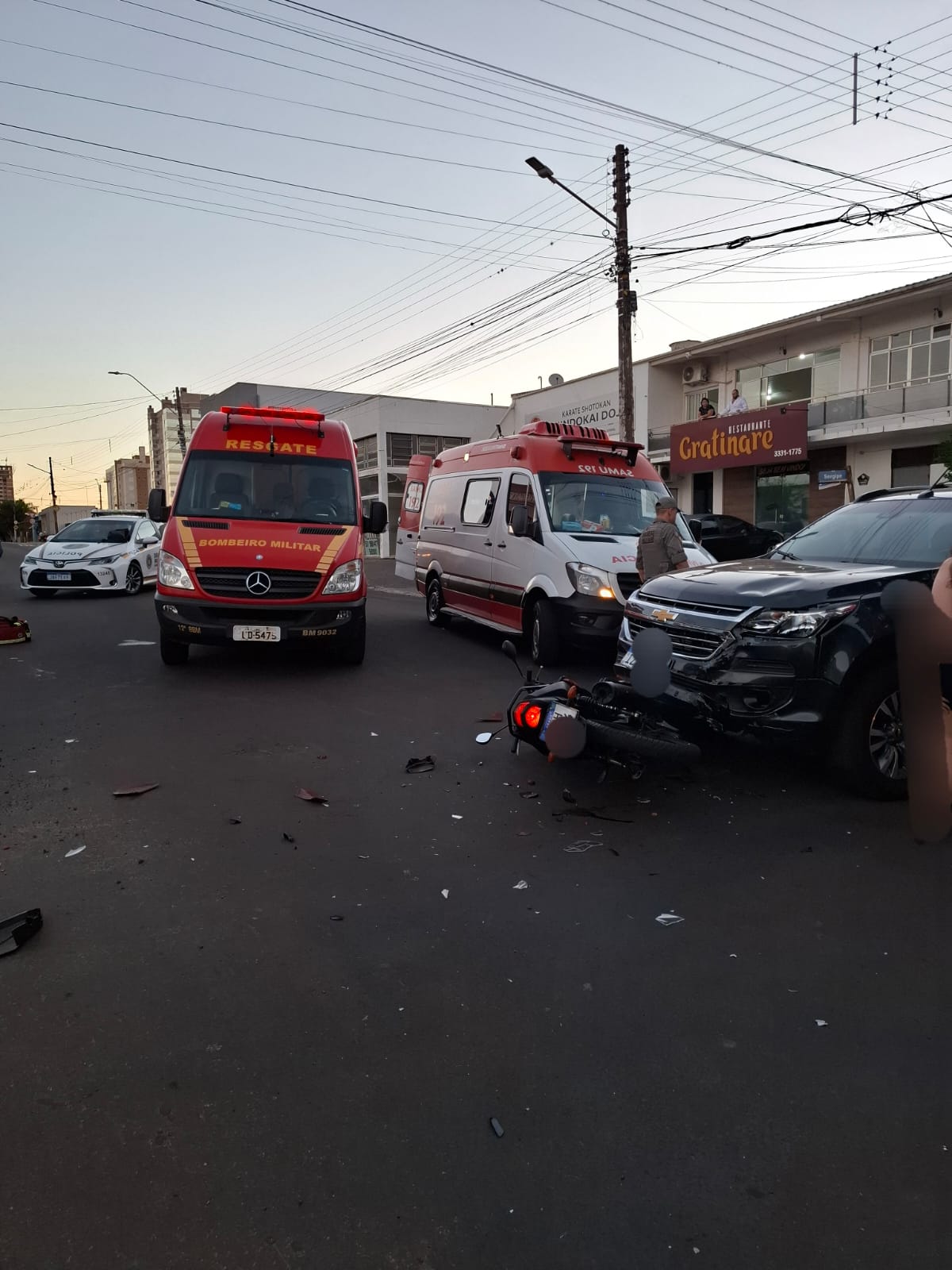 Colisão entre carro e motocicleta, por volta das 19 horas desta quinta-feira, na cidade de Ijuí, resultou em lesões graves no motociclista. O acidente ocorreu nas imediações da escola estadual de Ensino Médio Ruy Barbosa, o Ruyzão. O condutor da moto teve ferimentos intensos numa das pernas. O Samu presta atendimento. Por enquanto não há informação de outras pessoa ferida.