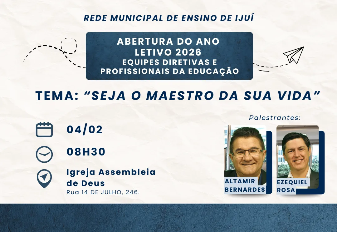 A programação desta quarta-feira contará com a palestra “Seja o maestro da sua vida – descobrindo seus superpoderes para assumir a maestria da vida”, ministrada por Altamir Bernardes e Ezequiel Rosa. A atividade abordará temas relacionados à formação da mentalidade humana, à forma como o cérebro é educado, além dos cinco elementos da maestria. Já os professores vão voltar para as escolas municipais ijuienses no próximo dia 19. O ano letivo iniciará em 23 de fevereiro.