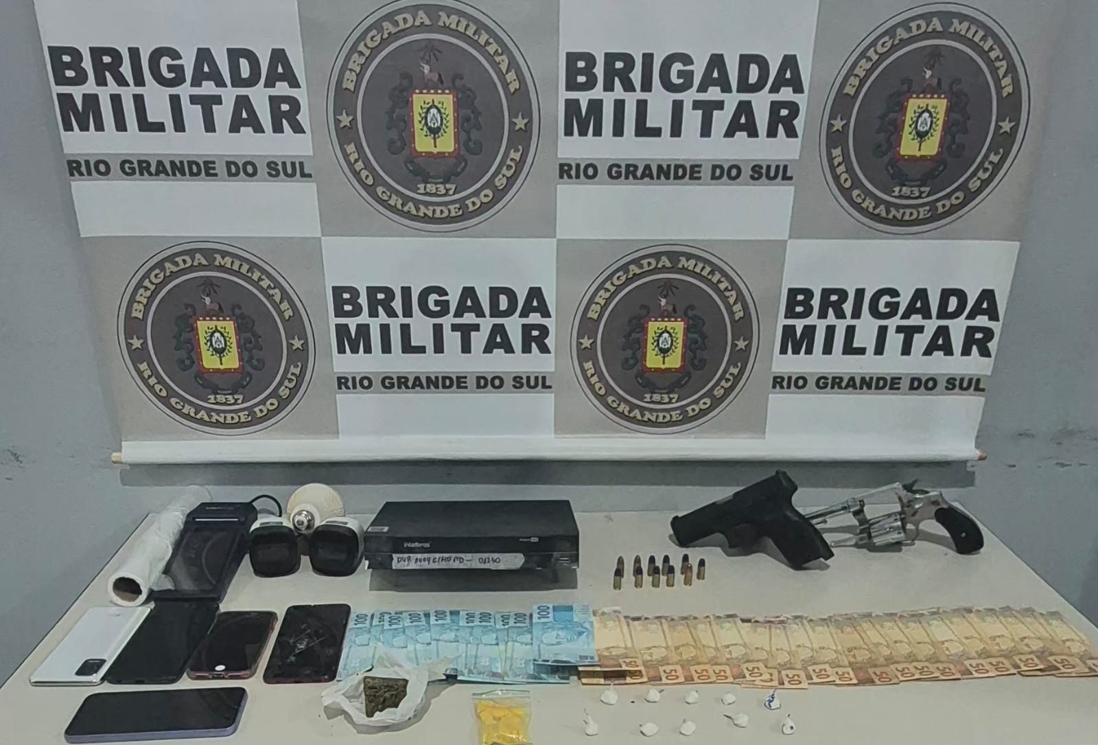 Ontem à noite, a Brigada Militar de Ijuí prendeu um homem suspeito de tráfico de drogas, no centro da cidade. Após informações que um indivíduo utilizava o estabelecimento, no centro de Ijuí, para o tráfico de entorpecentes, policiais abordaram o acusado e localizaram com ele 10 porções de cocaína. No interior do estabelecimento ocorreu apreensão de mais 23 porções de droga sintética e uma porção de maconha. Informado pelo suspeito, em diligências na casa dele brigadianos de Ijuí encontraram uma pistola 9 milímetros, municiada com 11 munições, e um revólver calibre 38.