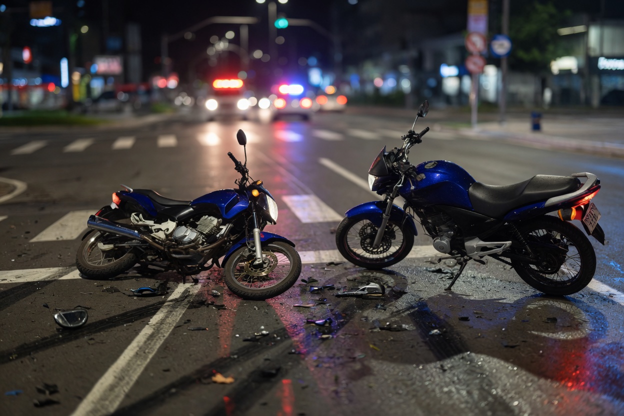 Imagem ilustrativa criada por IA. Um acidente de trânsito com lesões foi registrado no início da noite desta terça-feira (20), na área central de Ijuí. A ocorrência envolveu duas motocicletas e deixou duas pessoas feridas.