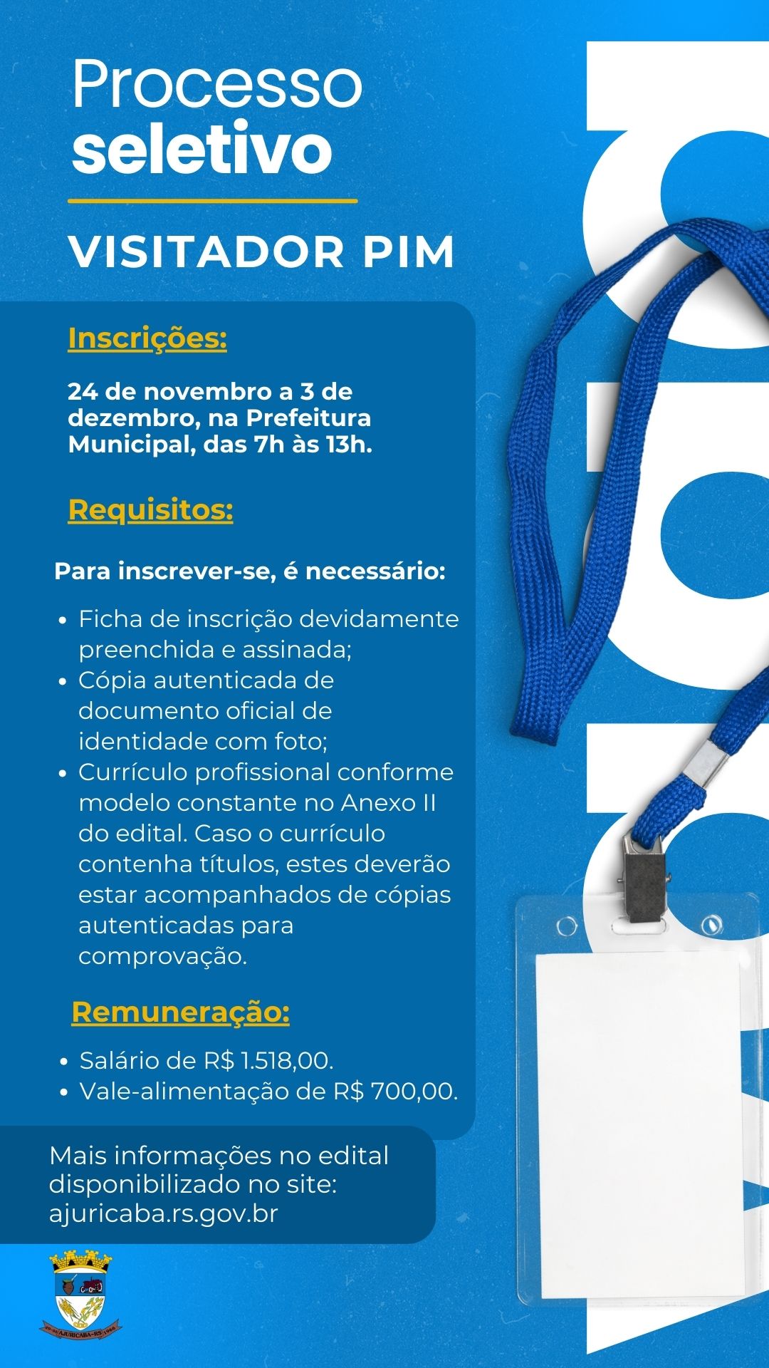 O Município de Ajuricaba informa que estão abertas as inscrições para o Processo Seletivo Simplificado destinado à contratação, por prazo determinado, de visitador do Programa Primeira Infância Melhor (PIM). O cargo prevê vencimento mensal de R$ 1.518,00, além de vale-alimentação no valor de R$ 700,00.