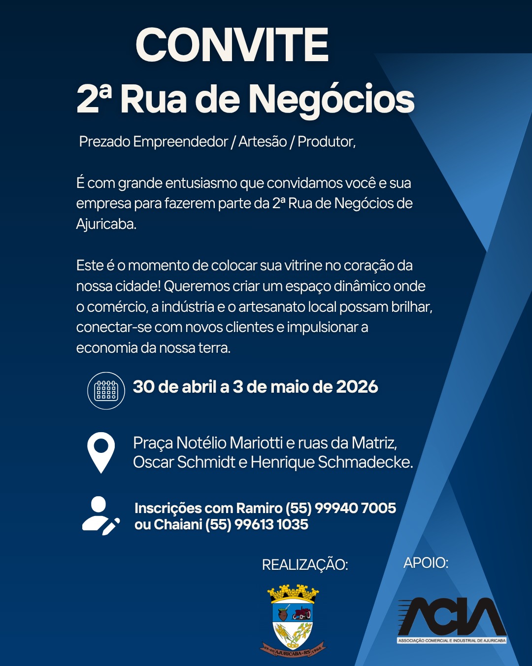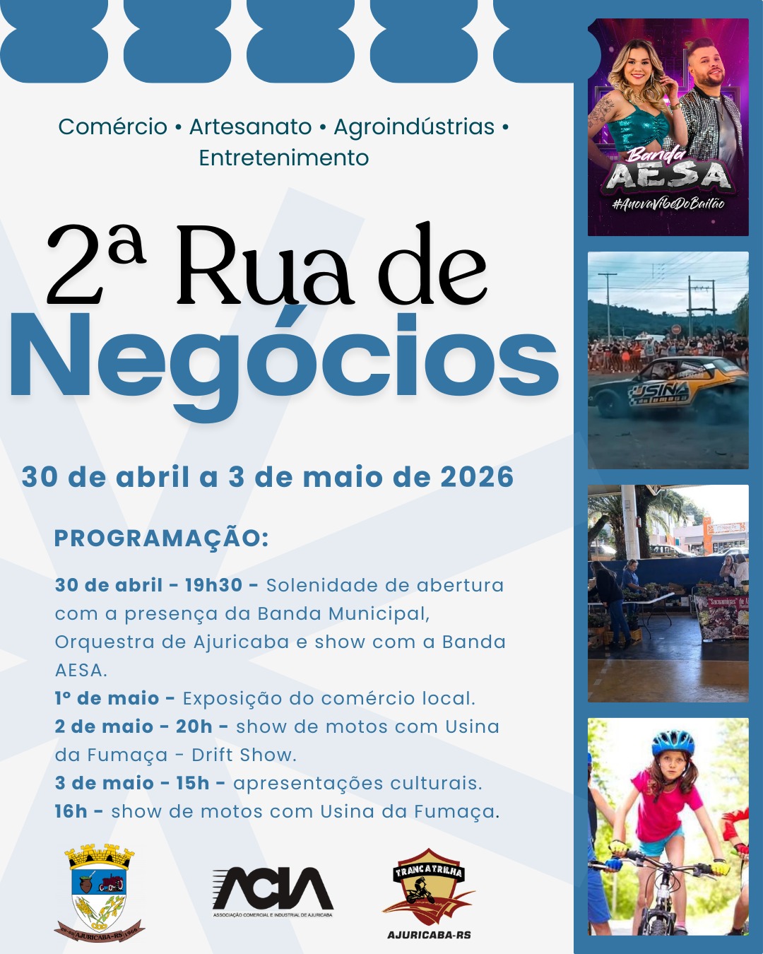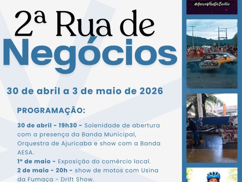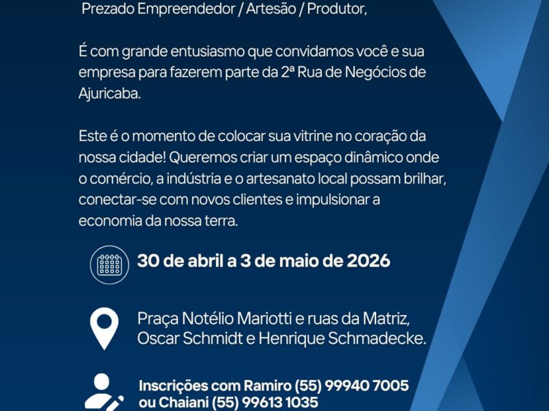 Um dos destaques é a 2ª edição da Rua de Negócios, que ocorre de 30 de abril a 3 de maio, no centro de Ajuricaba. O evento deve reunir comércio, agroindústrias, atrações culturais e opções de entretenimento, com apoio de entidades locais e do Governo do Estado.