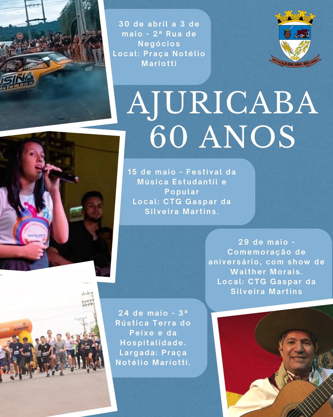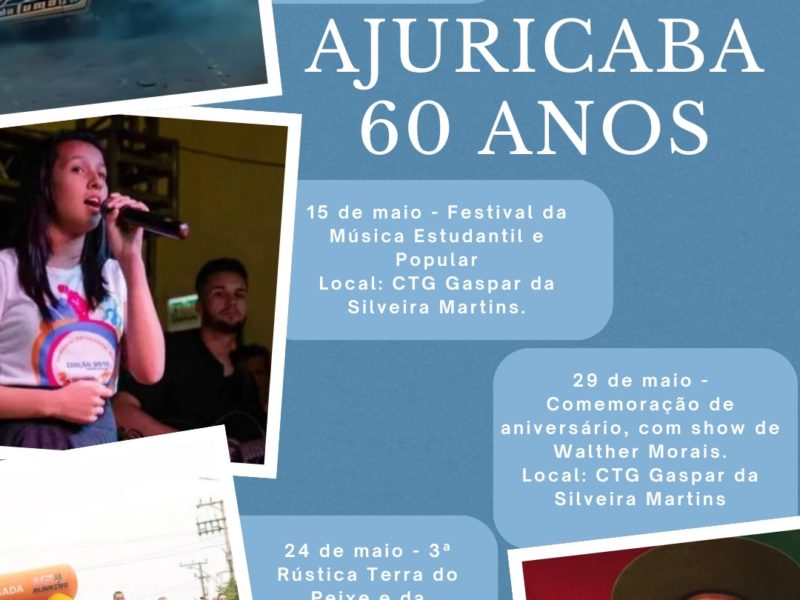 Foto: Assessoria Prefeitura de Ajuricaba Ajuricaba comemora, ao longo do mês de maio, os 60 anos de emancipação político-administrativa com uma programação que reúne atividades culturais, comunitárias e de incentivo ao desenvolvimento local. A agenda foi organizada com o objetivo de envolver a população e valorizar a história e a identidade do município.