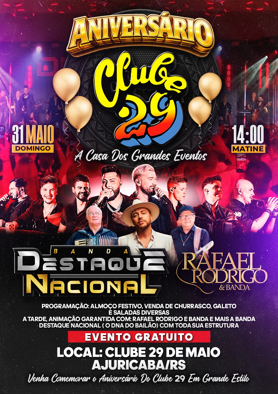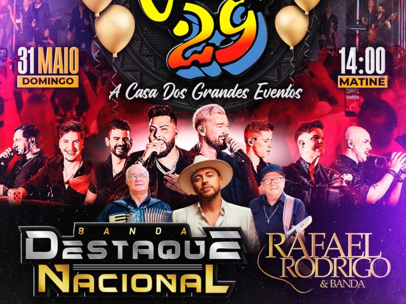 Dentro das celebrações, também será realizado o aniversário do Clube 29 de Maio, no dia 31 de maio, com programação festiva a partir das 14h, incluindo almoço, atividades e apresentações musicais com Banda Destaque Nacional e Rafael Rodrigo & Banda.