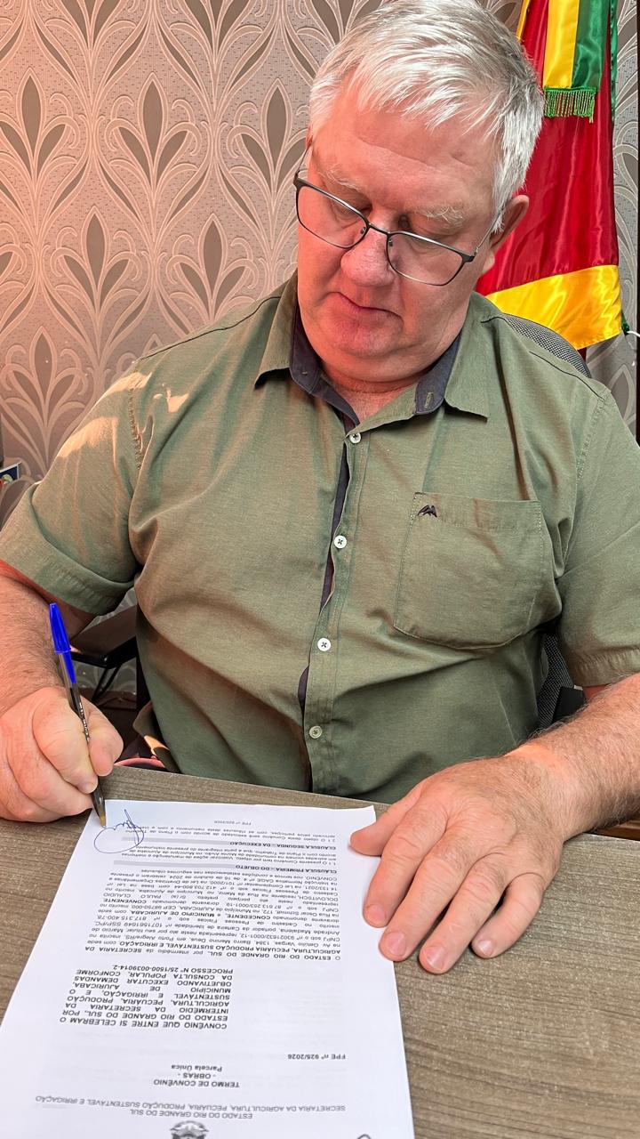 O prefeito de Ajuricaba, Paulo Dolovitsch, assinou, nesta sexta-feira, convênio com o Governo do Estado, por intermédio da Secretaria de Agricultura, Pecuária, Produção Sustentável e Irrigação, visando a execução de demandas da Consulta Popular de 2025. O convênio tem como objetivo viabilizar ações de manutenção e melhorias em estradas vicinais na comunidade de Monte Alvão, contribuindo diretamente para o escoamento da produção e a mobilidade dos moradores da localidade.