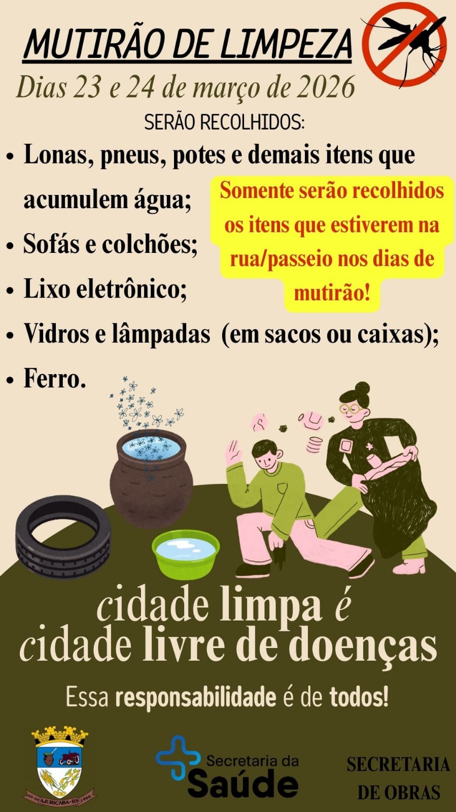 A Administração Municipal destaca que esta será a única oportunidade no ano em que haverá o recolhimento de todos os tipos de resíduos. Entre os materiais que poderão ser descartados estão lonas, pneus, potes e demais recipientes que acumulam água, sofás, colchões, lixo eletrônico, vidros, lâmpadas (devidamente acondicionadas em sacos ou caixas) e objetos de ferro.