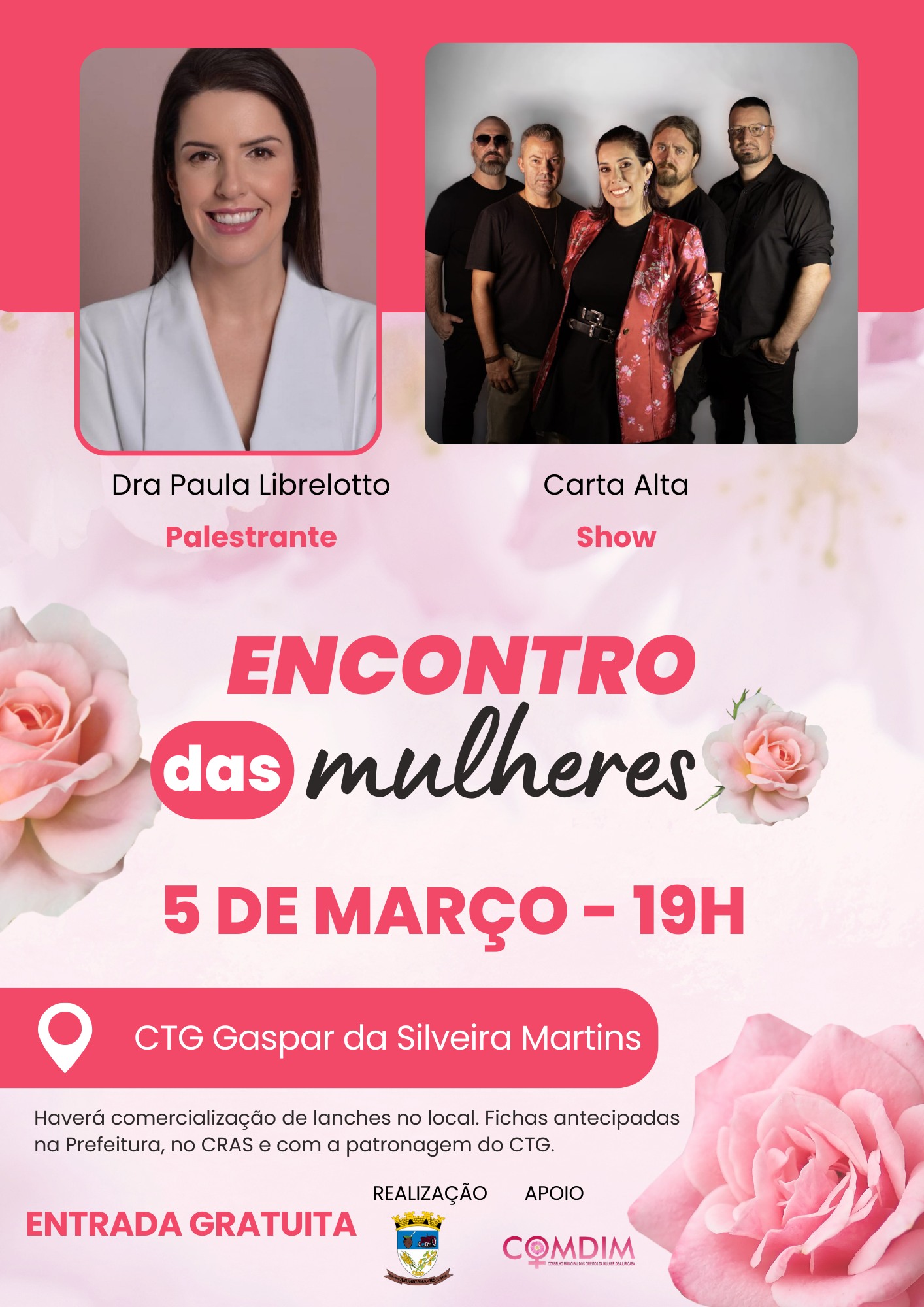 Hoje, o município de Ajuricaba vai realizar atividades alusivas ao Dia Internacional da Mulher. O evento, com entrada gratuita, vai acontecer no CTG Gaspar da Silveira Martins, a partir das 19 horas. Inicialmente vai ter palestra da médica e prefeita de Cruz Alta, Paula Librelotto, que abordará temas voltados ao fortalecimento feminino, autoestima e qualidade de vida. Na sequência, o público poderá prestigiar show com a banda Carta Alta. Durante o evento em Ajuricaba, nesta noite, haverá comercialização de lanches pelo CTG Gaspar da Silveira Martins. As fichas podem ser adquiridas antecipadamente na secretaria municipal de Assistência Social, no setor de protocolo da Prefeitura e na loja Janadai.