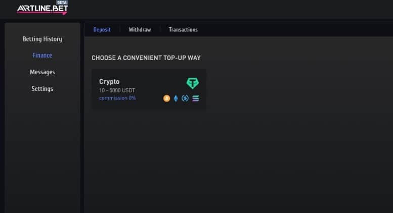A ArtlineBet aceita depósitos em várias criptomoedas, mas todos os saldos são mantidos em USDT (Tether).