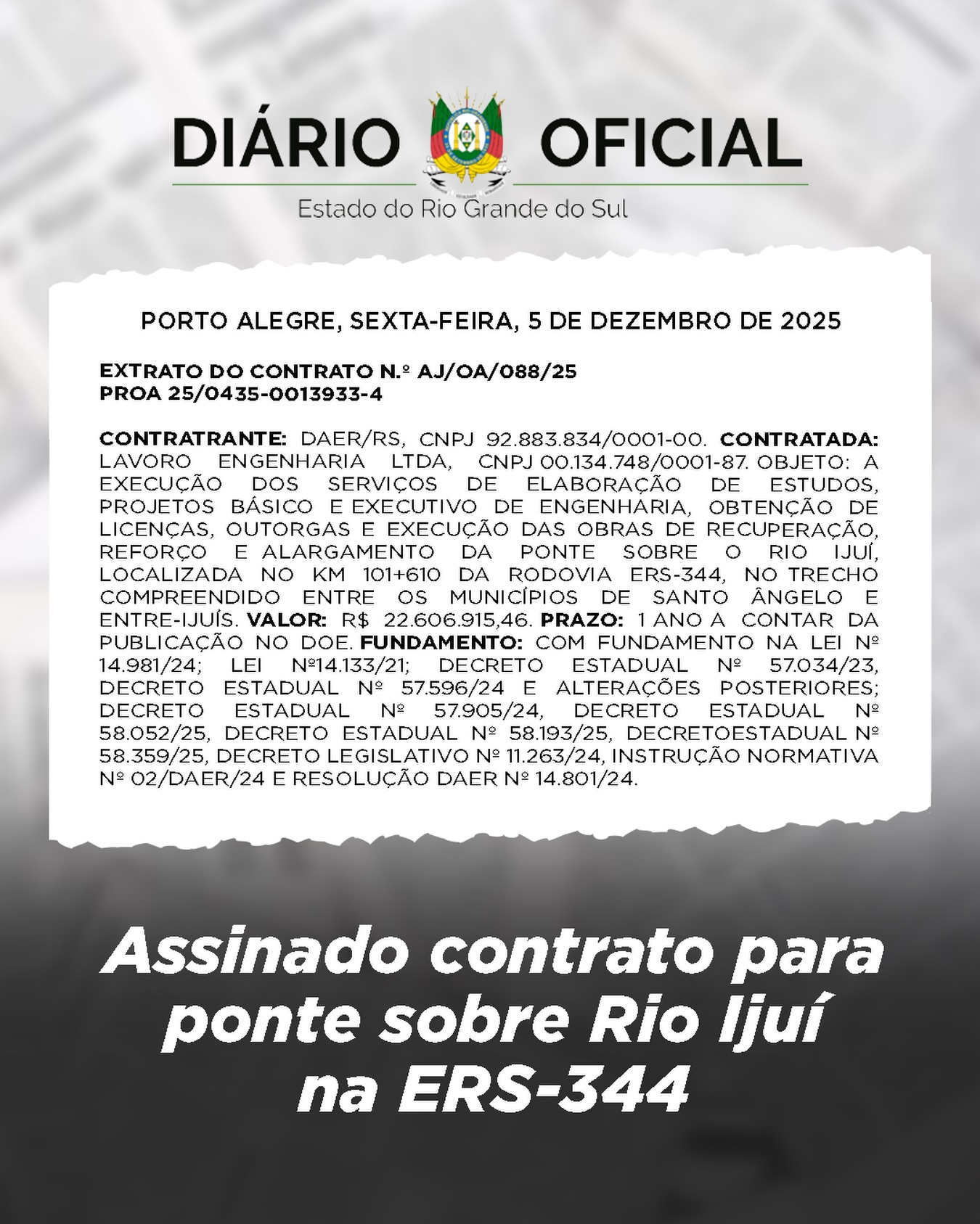 A edição extra do Diário Oficial do Estado de ontem, 05, trouxe importante notícia para as Missões. Está assinado o contrato com a empresa que fará os projetos e a obra de ampliação, reforço e melhorias na ponte sobre o Rio Ijuí, na ERS-344 limite entre Santo Ângelo e Entre-Ijuís. A travessia inaugurada na década de 50 apresenta-se bastante deteriorada e preocupa a comunidade regional e os motoristas que utilizam a ponte.