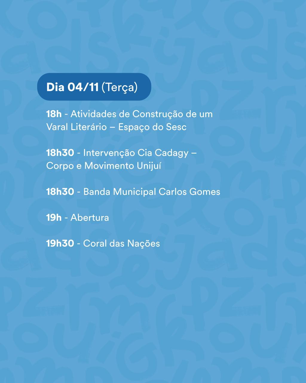 Com o tema “Ler o mundo, colecionar histórias e eternizar memórias”, a feira homenageia a União das Etnias de Ijuí (UETI). A programação, que se estende até o dia 9 de novembro, inclui contação de histórias, dinamização de livros infantis, apresentações de música, dança e teatro, além da Mostra Pedagógica da Rede Municipal de Ensino, que estará exposta durante todo o evento.