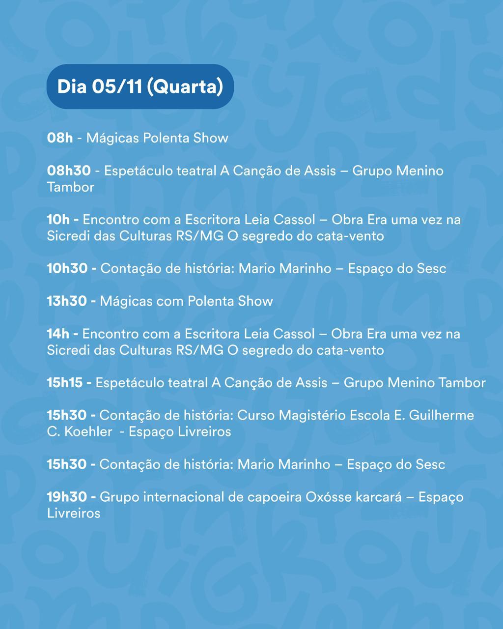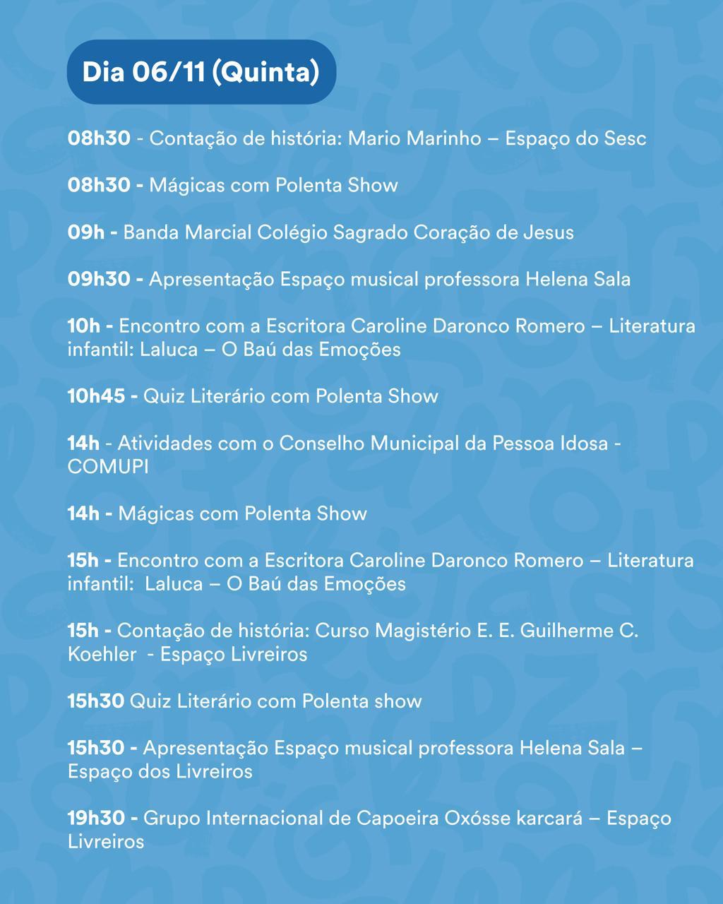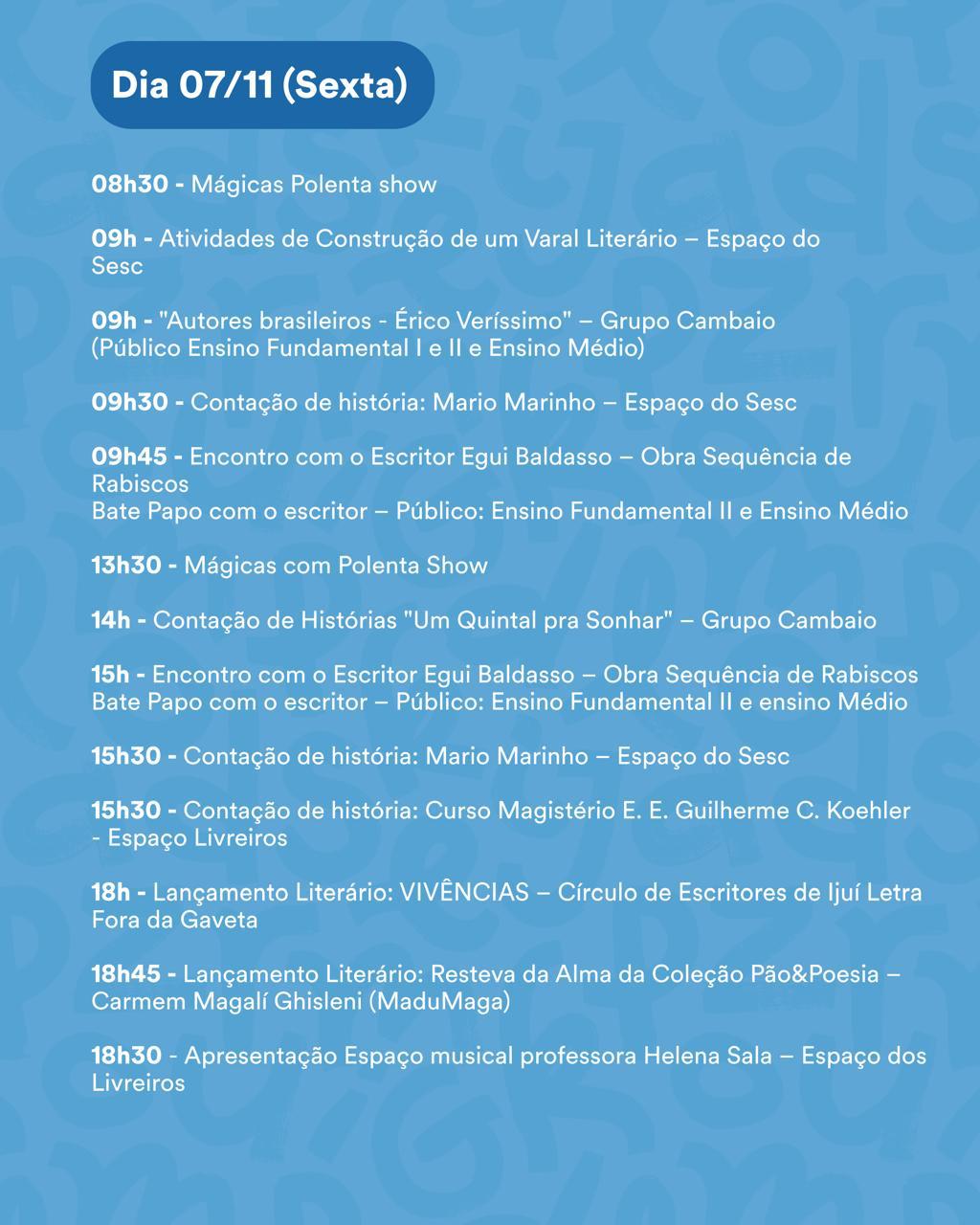 Entre as atrações confirmadas estão o Coral das Nações, que se apresenta logo após a abertura oficial, e a participação dos escritores Leia Cassol e Egui Baldasso. Além das tradicionais presenças de editoras, livrarias e demais expositores.