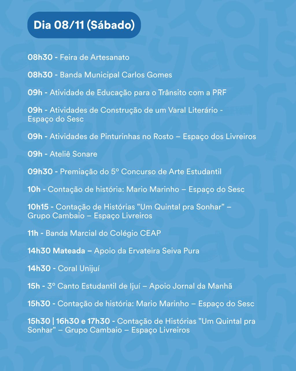 As atividades ocorrerão no anfiteatro principal e em um segundo palco montado no centro da praça, destinado a intervenções culturais de grupos e artistas locais. Toda a programação é gratuita e aberta ao público de todas as idades. A feira do livro é uma iniciativa do SESC de Ijuí, em parceria com o Poder Público Municipal com apoio da Sicredi das Culturas RS/MG e Unijuí.