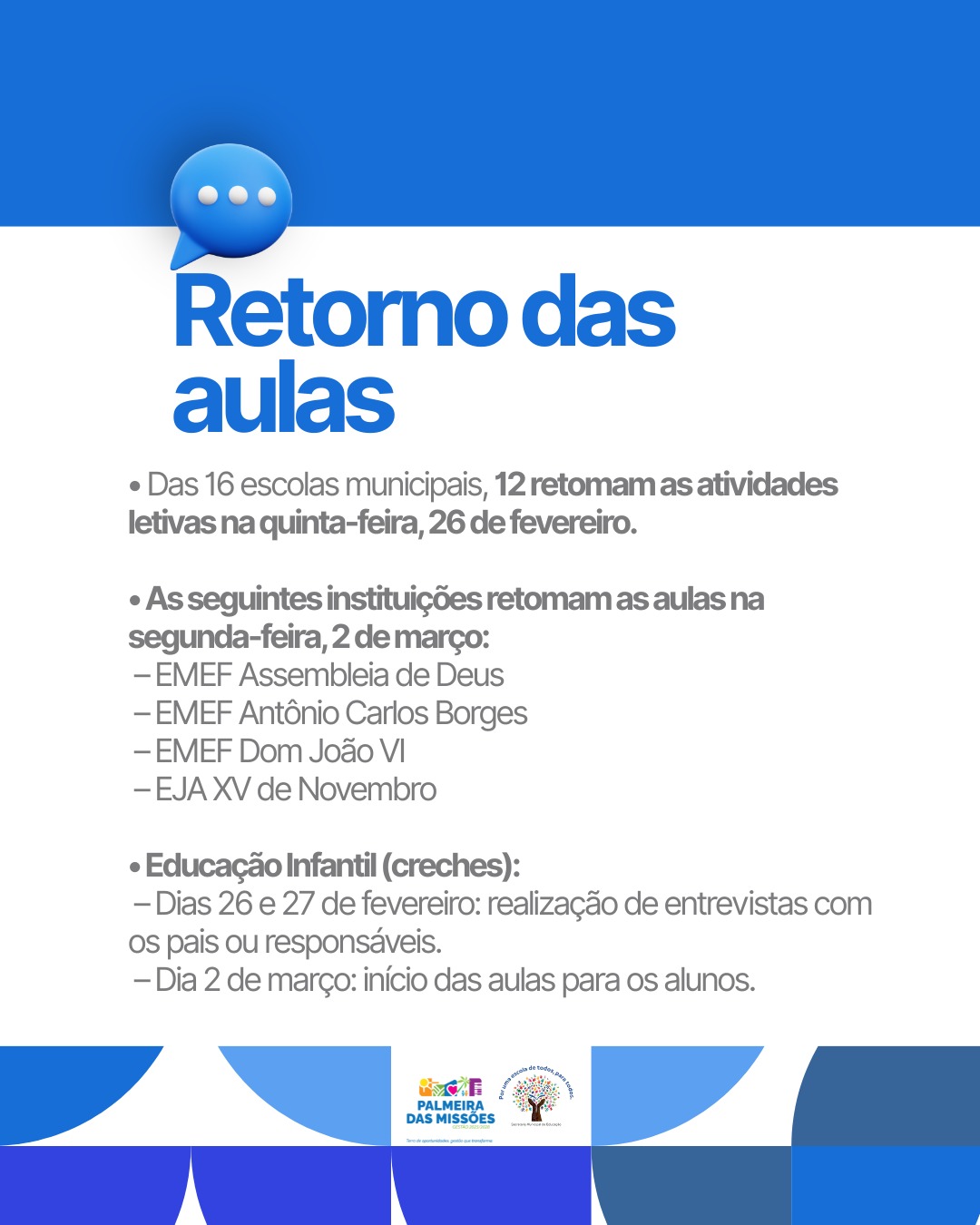 Das 16 escolas municipais de Palmeira das Missões, 12 retomam hoje as aulas, que estavam suspensas desde quinta-feira passada, visto prejuízos causados pelo temporal. Já as escolas municipais Assembleia de Deus, Antônio Carlos Borges, Dom João VI e EJA XV de Novembro vão reiniciar atividades na próxima segunda-feira. Na Educação Infantil, hoje e amanhã acontecem entrevistas com pais ou responsáveis dos alunos, e o início das aulas será também segunda-feira que vem.