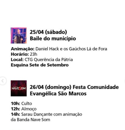 Hoje à noite haverá o baile de aniversário do município de Eugênio de Castro. A programação vai ocorrer no CTG Querência da Pátria, localidade de Esquina Sete de Setembro, a partir das 23 horas, com animação de Daniel Hack e Os Gaúchos Lá de Fora. Eugênio de Castro vai completar, quarta-feira, dia 29, 28 anos de emancipação. Na data, vai ser feriado municipal e à tarde vai ter variada programação, com gincana cultural, 1ª Feira da Saúde e Assistência Social, show com Vanderlei Rodrigo, dentre outras atrações na rua coberta, praça José Dezórdi.