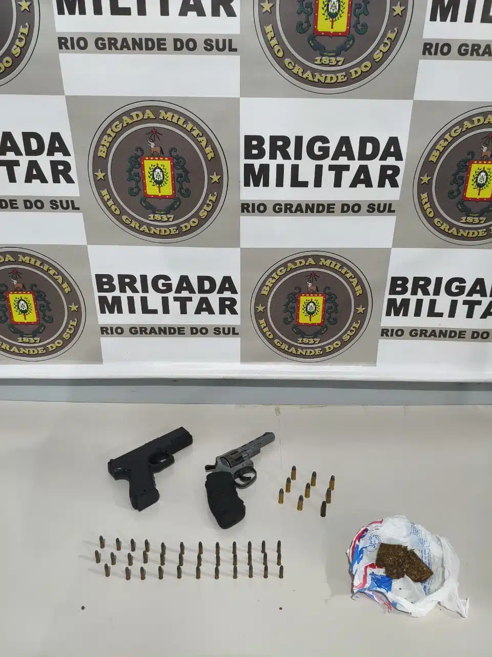 Ao avistar a viatura, ele tentou se esconder, mas foi abordado. Em revista pessoal, houve localização de um revólver calibre 32, municiado com sete munições, e uma porção de maconha. Na casa, brigadianos encontraram mais duas munições de calibre 32, 35 munições calibre 22 e um simulacro de pistola. O adolescente foi apresentado na Polícia Civil.