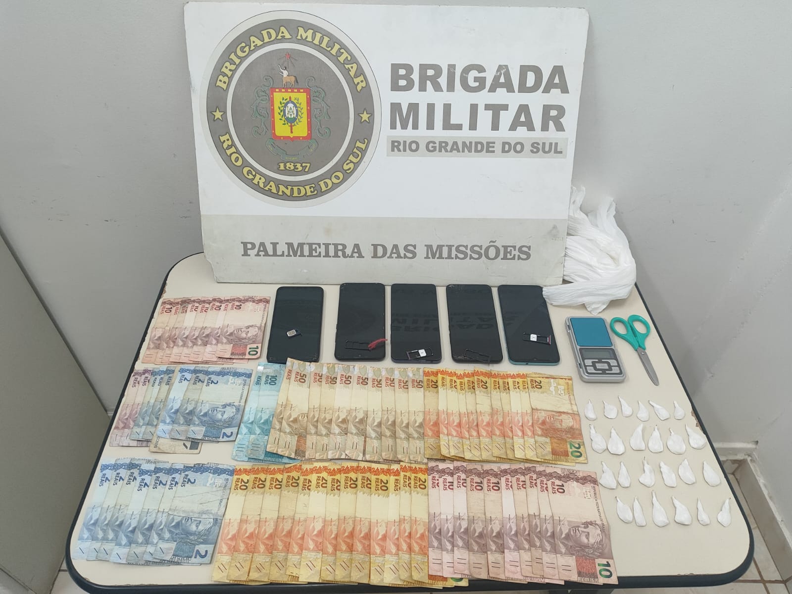 A Brigada Militar de Palmeira das Missões prendeu dois homens acusados de tráfico de drogas. A ação teve início após uma guarnição abordar os indivíduos e apreender 24 buchas de cocaína, aproximadamente 20g, uma balança de precisão, R$ 1.398,00 em notas diversas e cinco celulares. O material foi localizado com um dos homens, além de uma bucha de cocaína encontrada com o outro. Após o registro da ocorrência, o homem de 58 anos foi liberado, enquanto o de 50 anos, que possui antecedentes criminais, permaneceu preso.