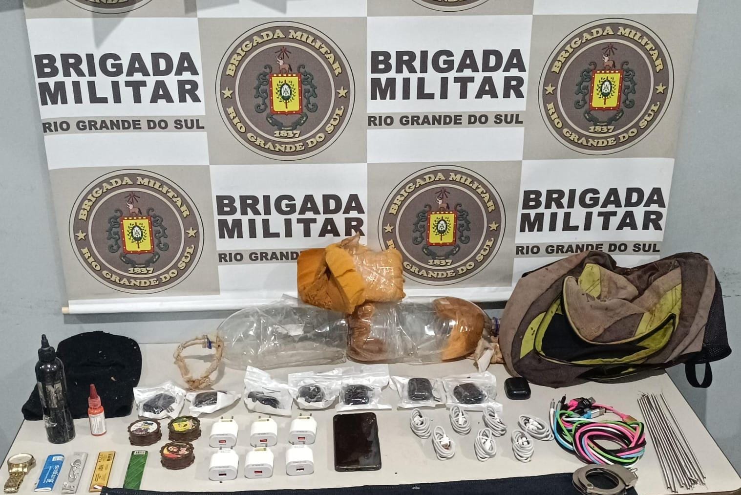 Numa mochila, os brigadianos encontraram objetos envoltos em fita adesiva, ou seja, telefone celular, fones de ouvido, carregadores de celular, diversos cabos para celular, esmurrugadores de droga, relógio de pulso, touca ninja, dentre outros produtos. O caso foi encaminhado para a Polícia Civil de Ijuí.