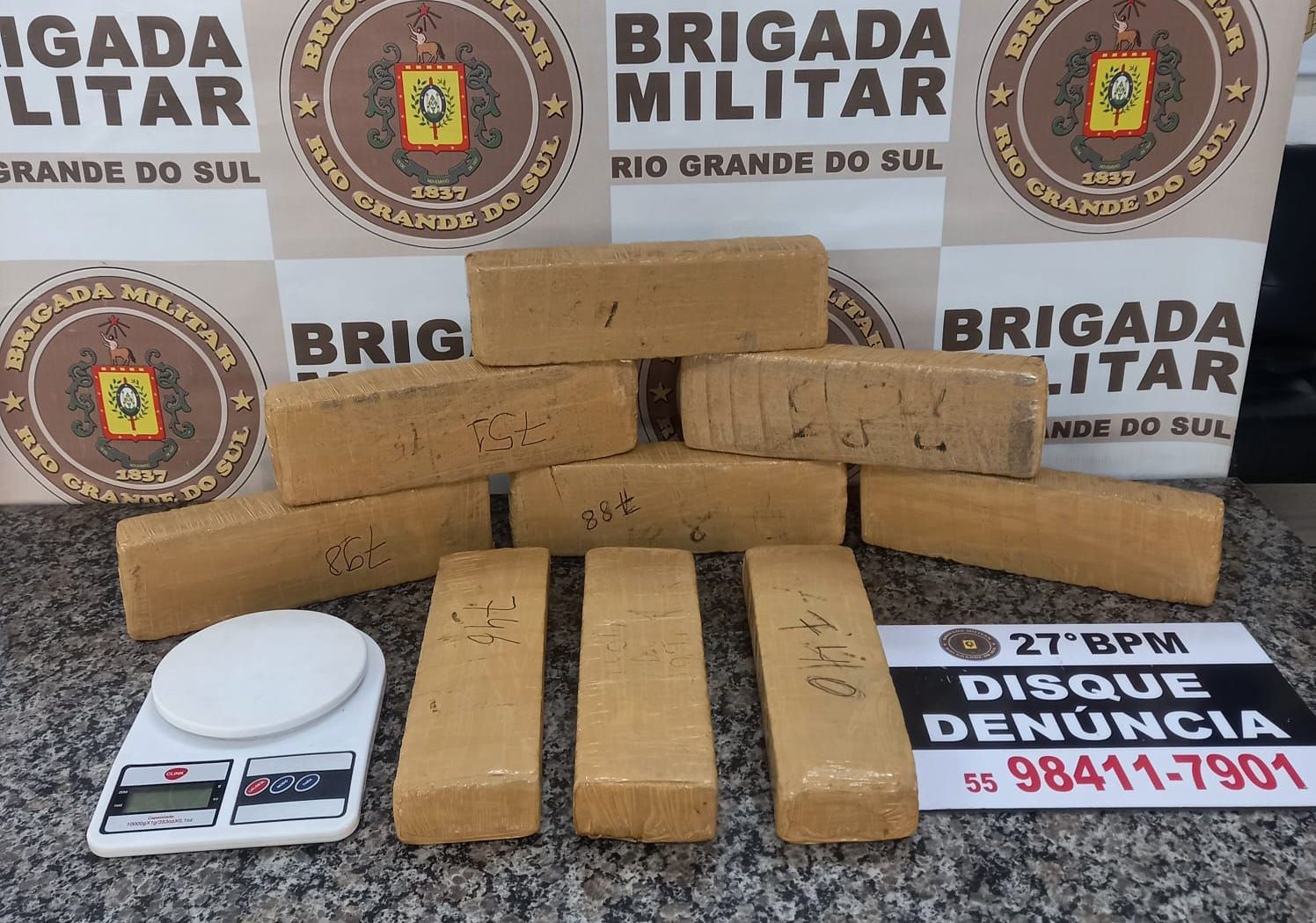 Em Santo Ângelo, ontem à tarde, a Brigada Militar prendeu uma mulher acusada de tráfico de drogas. Durante a ação, houve apreensão de nove tabletes de maconha, cerca de 6 quilos e 800 gramas, além de uma balança doméstica.