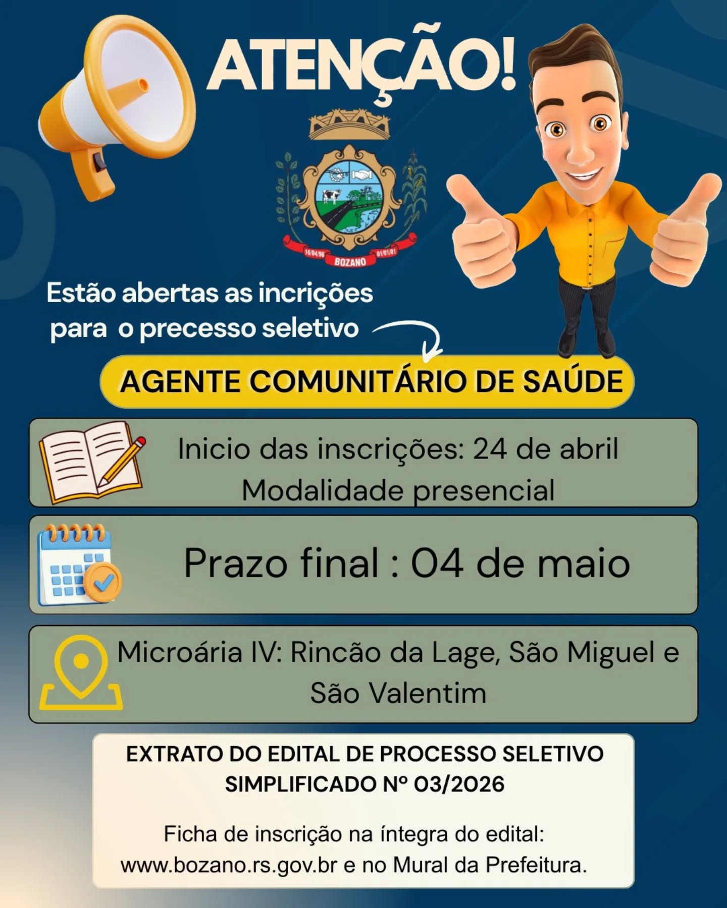 A prefeitura de Bozano recebe inscrições para seleção de agente comunitário de saúde. Há vagas para a microárea 4, que abrange as localidades de Rincão da Lage, São Miguel e São Valentim. Inscrições podem ser feitas até dia 4 de maio. A ficha de inscrição está no edital disponível no site bozano.rs.gov.br e no mural da prefeitura.
