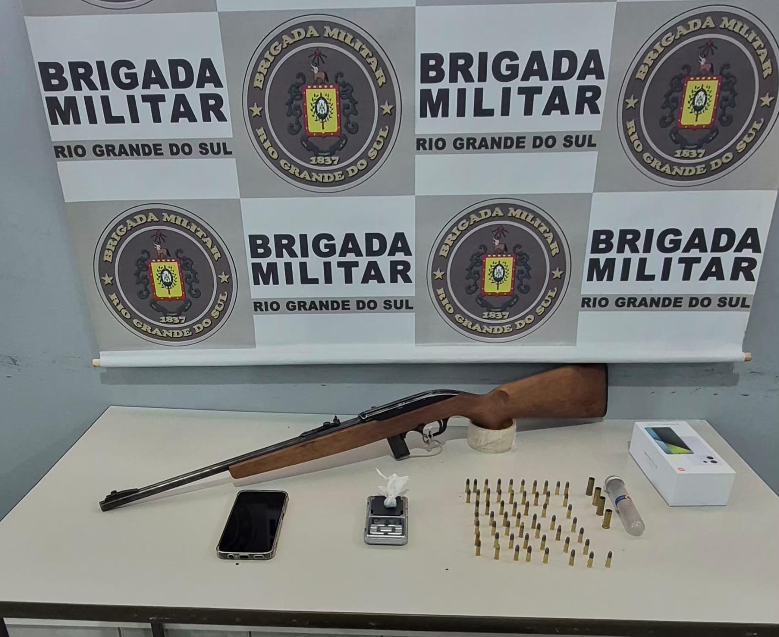 Na manhã de hoje, a Brigada Militar de Ijuí prendeu um homem na posse de uma arma de fogo, munição e outros materiais, no bairro Jardim. Policiais receberam informações de que um indivíduo estaria na posse de uma arma de fogo e que estaria fazendo a entrega de entorpecentes. O suspeito foi abordado. Trata-se de um homem, de 30 anos, natural de Ijuí, possuidor de antecedentes policiais por ameaça. Com ele houve localização de uma porção de maconha e um celular. Em diligências complementares, no local informado pelo suspeito, ocorreu apreensão de um rifle calibre 22, 55 munições do mesmo calibre, um celular e uma balança de precisão. O caso foi encaminhado para a Polícia Civil de Ijuí.
