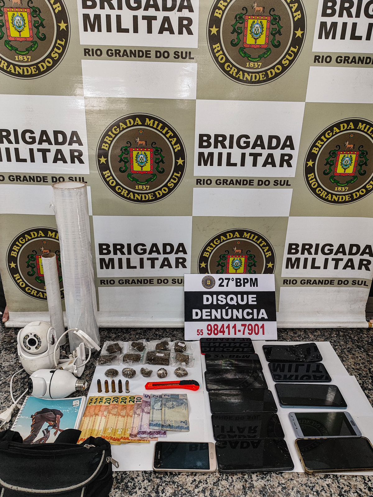 Com o suspeito, foram localizados e apreendidos invólucros de maconha, munições, dinheiro e materiais utilizados para o comércio de entorpecentes, além de uma motocicleta.