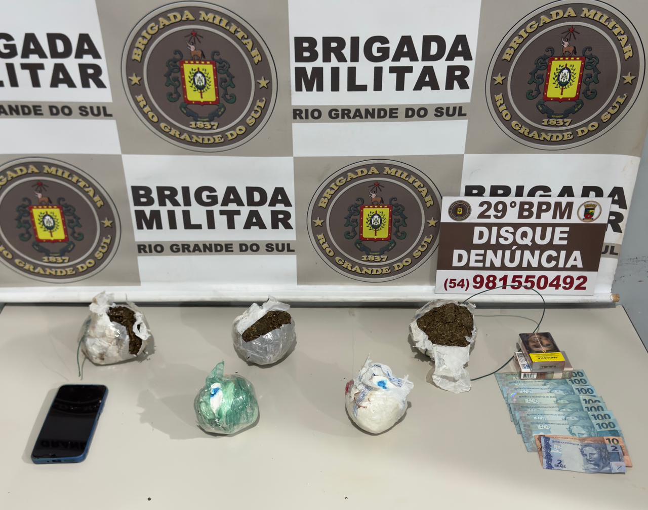 Foram apreendidos pouco mais de 1 kg de cocaína e 1 kg 161 g de maconha, além de uma considerável quantia em dinheiro e um celular. Diante dos fatos, ambos foram encaminhados para o registro do flagrante.