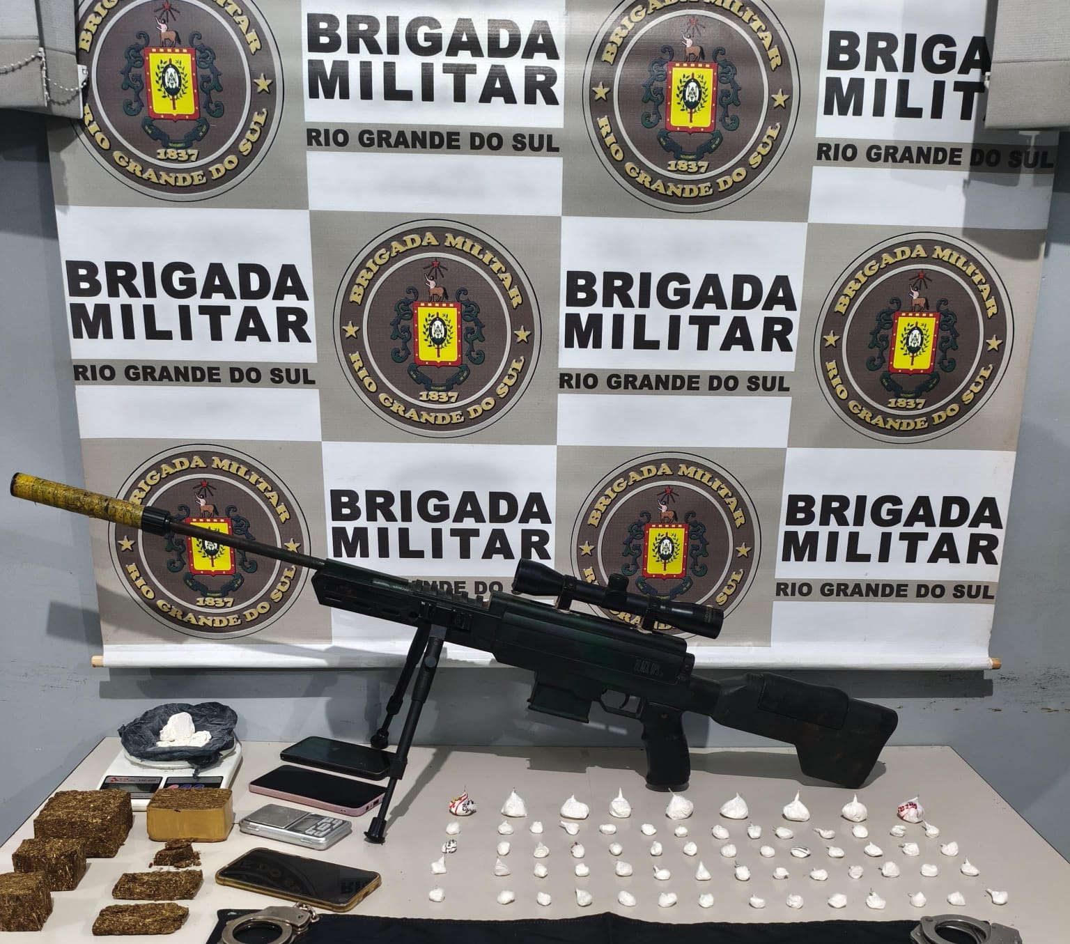 Ao todo, durante as diligências, foram apreendidas 65 buchas de cocaína (86g); 01 porção de cocaína (48g); 06 porções de maconha (399g); 01 tijolo de maconha (129g); 02 balanças de precisão, 03 aparelhos celulares, 01 carabina G.A.S. e 01 veículo VW Gol .