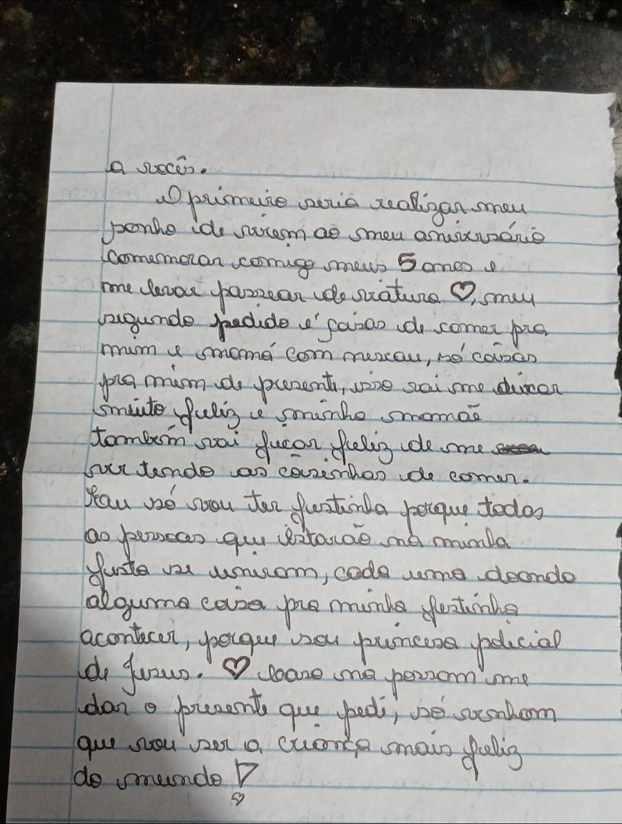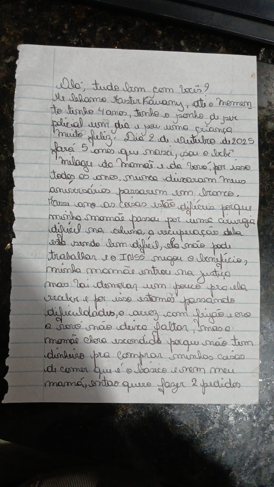 A Brigada Militar de Panambi compartilhou uma ação voluntária feita no fim de semana para uma menina de 5 anos, chamada Ester, que enviou uma carta para o efetivo expressando o sonho de se tornar policial e relatando as dificuldades enfrentadas por sua família.