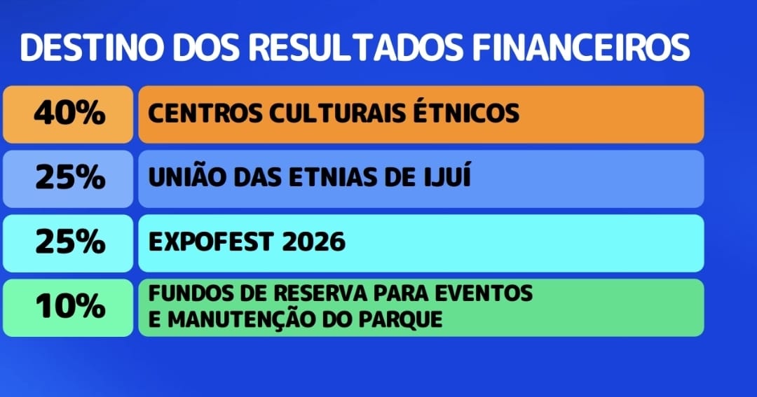 A União das Etnias recebe 25% do lucro, correspondendo a R$ 376. 341,77. Percentual semelhante, de 25%, ou seja, R$ 376.341,77, será destinado para a organização da Expofest Ijui 2026. Já 10%, ou seja, R$ 150. 536, 77, destinados a fundos de reservas para eventos e manutenção do parque.