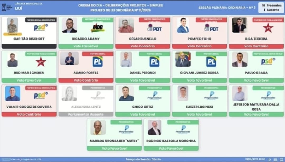 A Câmara Municipal de Vereadores de Ijuí realizou sessão ordinária, nesta segunda-feira, 19, na qual foram apreciados e votados importantes projetos de lei de interesse do funcionalismo público municipal, do Poder Legislativo e do Executivo. As matérias foram amplamente debatidas e, em sua maioria, aprovadas pelos parlamentares presentes.