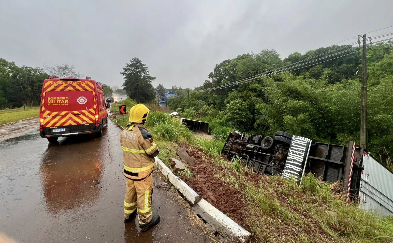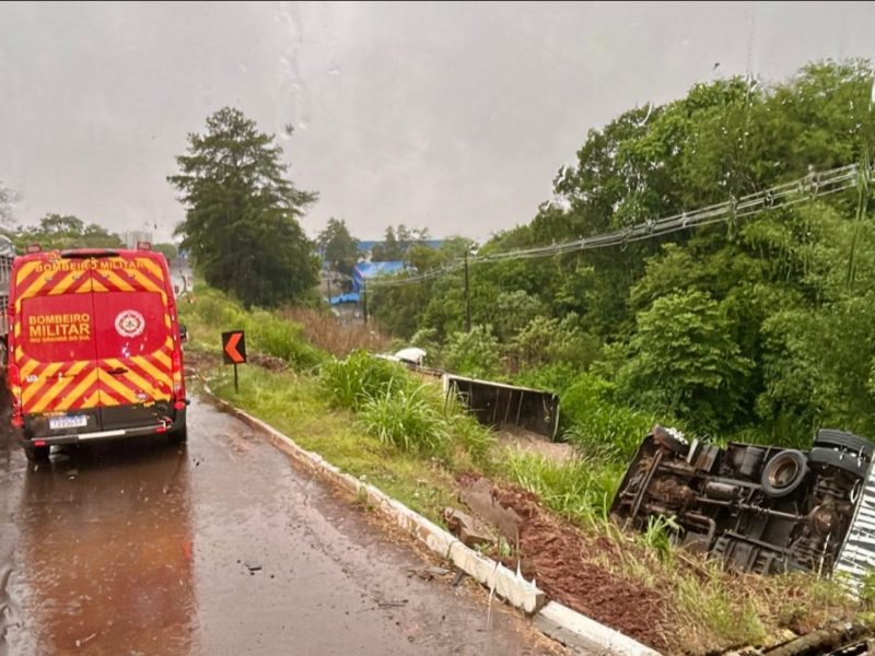 Dois caminhões tombaram em sequência no fim da tarde de ontem na ERS-223, em Ibirubá, no trevo de entroncamento com a ERS-506. Chovia no momento do acidente. O primeiro caminhão tem placas de Itajaí/SC. O veículo tombou e desceu um barranco de aproximadamente cinco metros de altura. O condutor teve lesões leves. Cerca de 20 minutos depois, um segundo caminhão tombou no mesmo trecho, cerca de 20 metros à frente do primeiro acidente. Trata-se de uma carreta com semirreboque, placa de Rio do Sul/SC. O motorista não apresentava ferimentos.