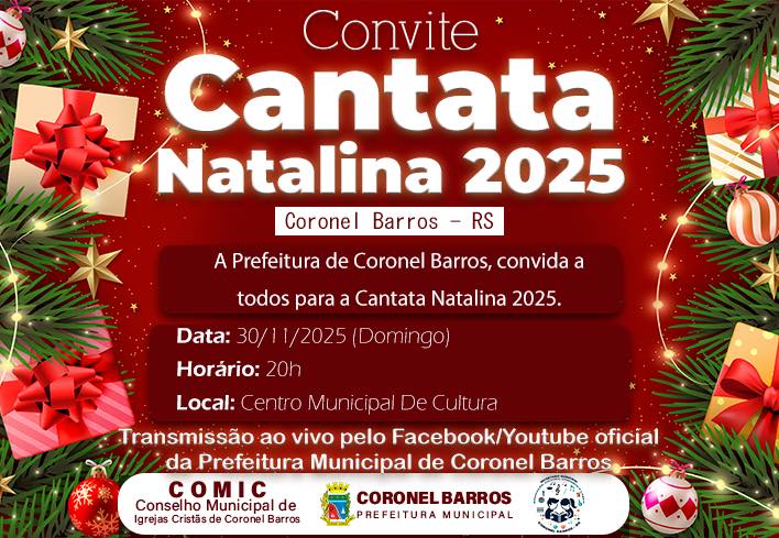 Neste domingo à noite, 30, haverá cantata natalina em Coronel Barros. O ato vai marcar o início das atividades de Natal no município. A programação vai ocorrer no Centro Municipal de Cultura, a partir das 20 horas, numa realização do COMIC – Conselho Municipal das Igrejas Cristãs de Coronel Barros – e Secretaria Municipal de Educação, Cultura, Desporto e Lazer.