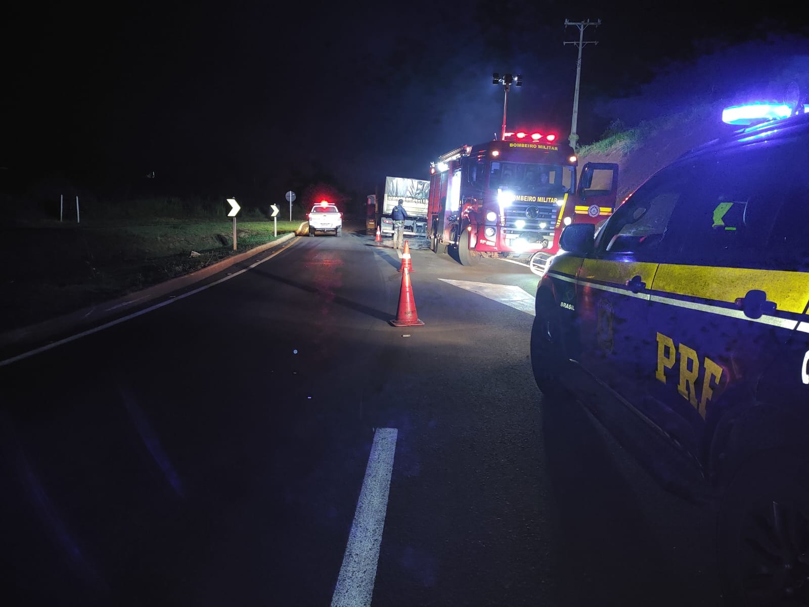 O Corpo de Bombeiros controlou o incêndio, sem registro de vítimas. A Polícia Rodoviária Federal informou que o incêndio atingiu dois rodados do semi-reboque.