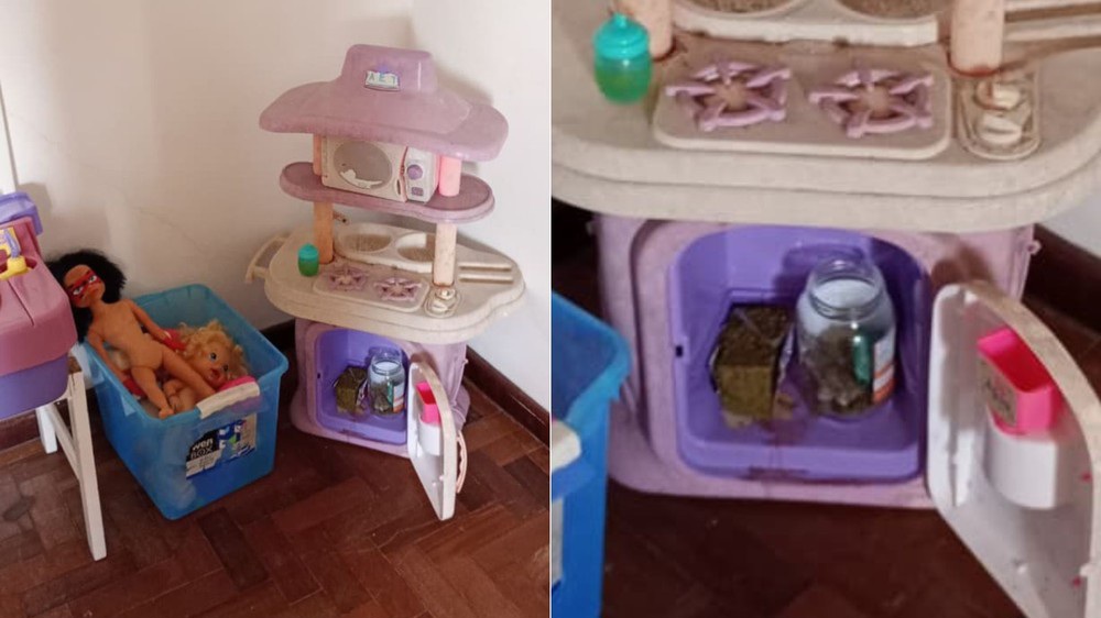 Durante a vistoria no imóvel, os policiais encontraram porções de maconha armazenadas no interior de uma casinha de bonecas pertencente à filha do casal, uma criança de 9 anos. No mesmo brinquedo, havia ainda uma balança de precisão e embalagens plásticas, que, conforme a polícia, indicam a possível preparação da droga para comercialização.