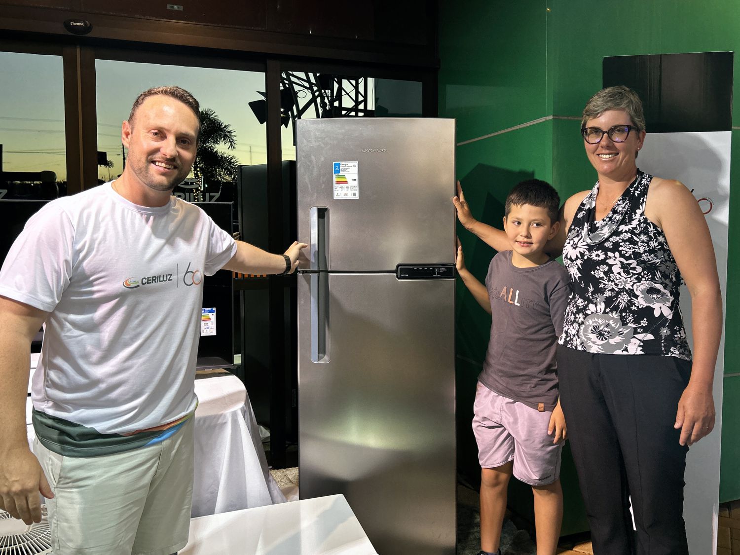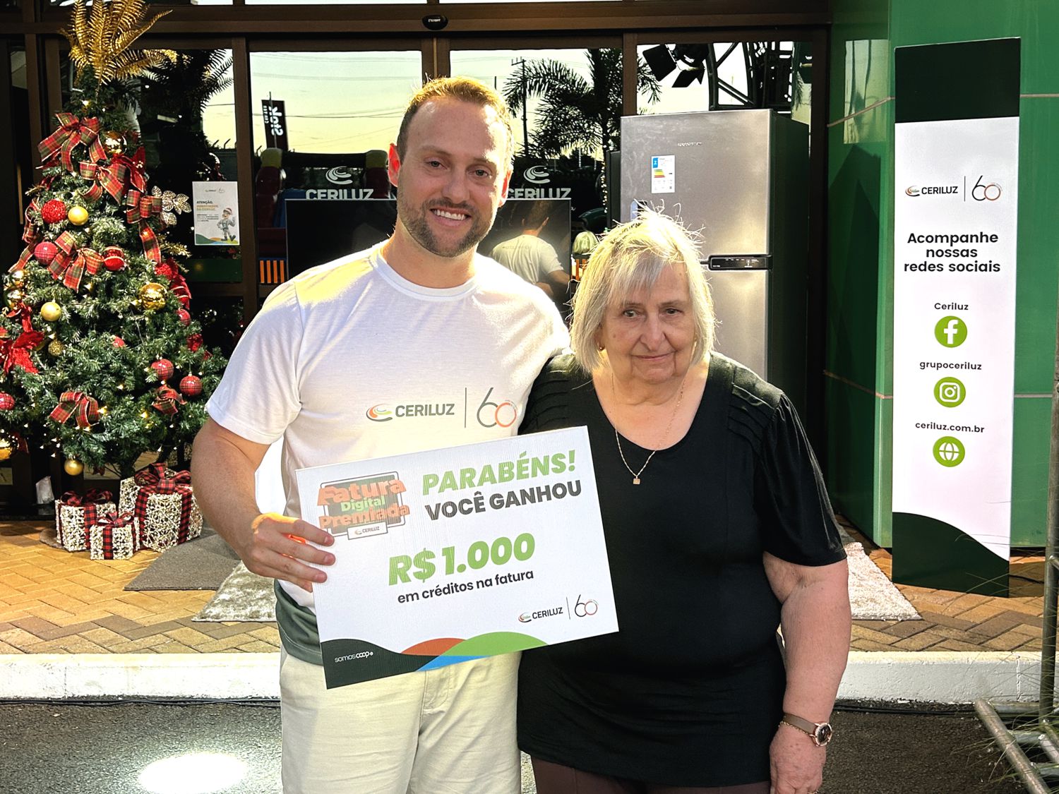 Os demais contemplados — Rafael Sartori (smart TV 55”), Lorena Maria Berton (ar-condicionado split), Maria Claudete Franco (crédito de energia de R$ 1.500,00), Edemar Weich (crédito de energia de R$ 500,00) e Valmor José Dalla Corte (forno elétrico) — não puderam estar presentes e receberão seus prêmios em outra oportunidade.