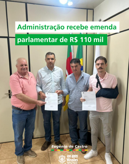 O município de Eugênio de Castro recebeu emenda de 110 mil reais, do deputado federal, Afonso Hamm, do Progressistas. O dinheiro vai ser investido na compra de um veículo para a saúde. Ficou acertado que a prefeitura de Eugênio de Castro mais 100 mil reais na construção do Centro de Convivência do Idoso e outros 10 mil reais, por meio de convênio, para a comunidade Novo Porto Alegre.