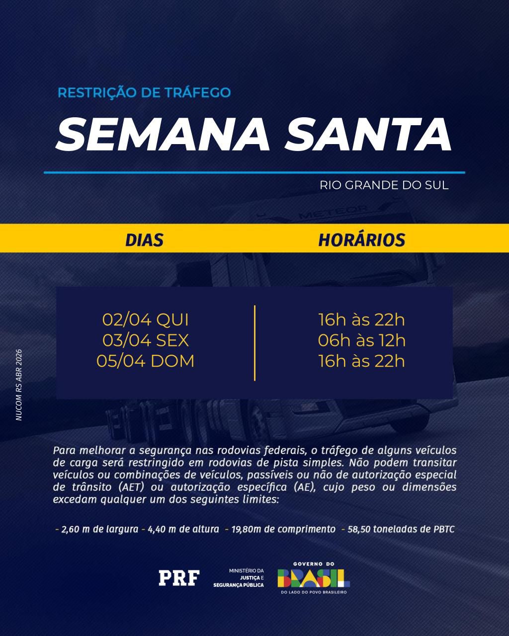 Em razão de operação especial de polícias rodoviárias referente à Semana Santa, veículos longos não poderão circular nessa quinta-feira, 03, das 16 às 22 horas, em rodovias federais e estaduais de pista simples. São veículos, por exemplo, que precisam de autorização especial de trânsito. Amanhã, Sexta-Feira Santa, essa medida vai vigorar das 6 horas ao meio-dia, e domingo das 16 às 22 horas.