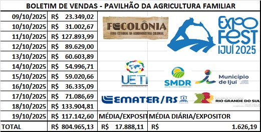 O total de vendas na agricultura familiar na Expofest deste ano foi de 804 mil, 965 reais, média da 17 mil, 888 reais por expositor. Em 2024, o total foi de 630 mil e 400 reais. Já a média diária de comercialização, por agroindústria, ficou em mil, 626 reais. A Expofest foi realizada do último dia 9 até ontem, no parque Wanderley Burmann. Participaram cerca de 450 empresas.