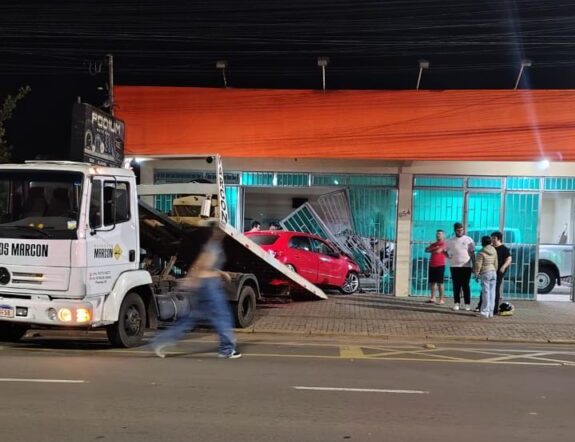 Foto: Rádio Sulbrasileira O condutor de um automóvel Gol atingiu a porta de entrada de uma empresa de autopeças situada na Avenida Presidente Kennedy, bairro Piratini, em Panambi.