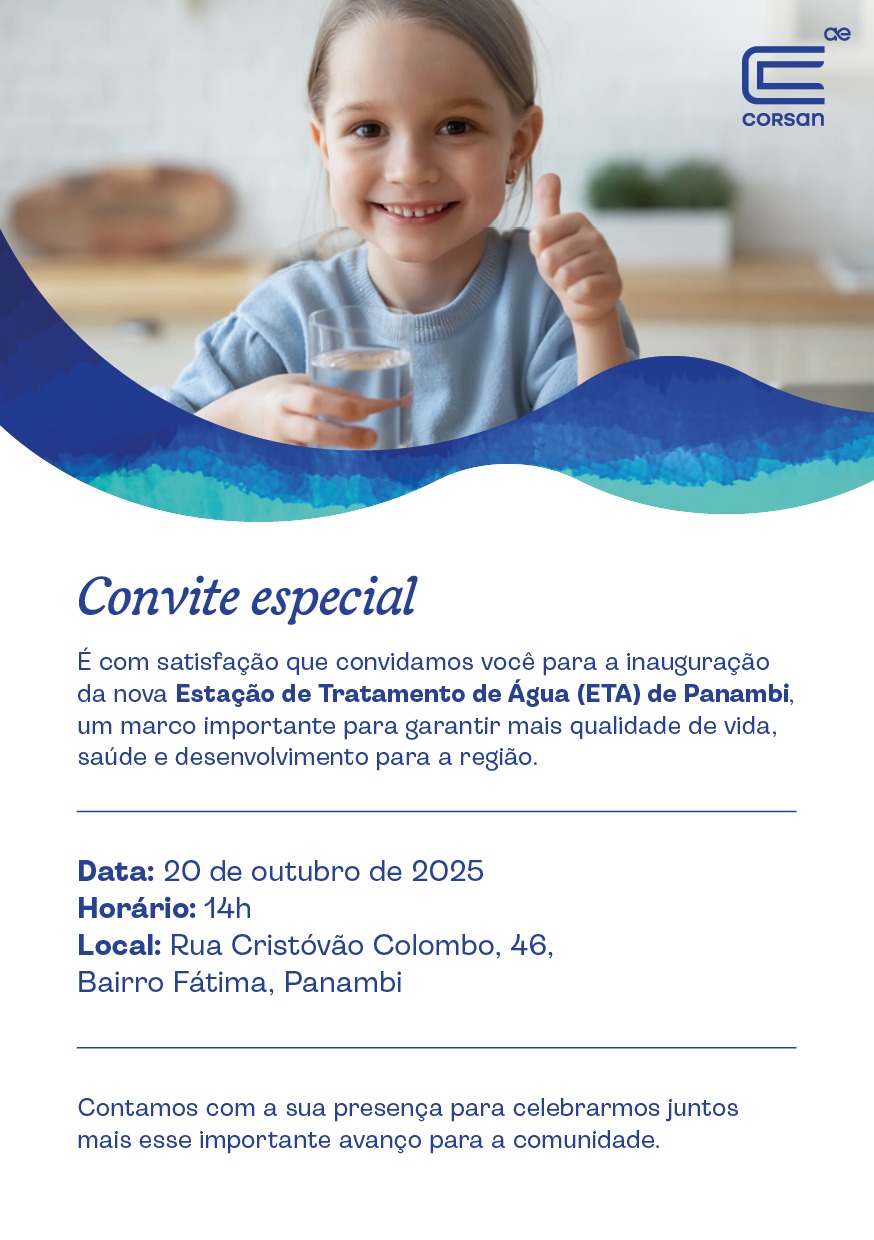 Hoje, às 14 horas, a Corsan vai inaugurar a nova Estação de Tratamento de Água em Panambi. A estrutura foi construída à rua Cristóvão Colombo, bairro Fátima, investimento de 30 milhões de reais. A obra vai beneficiar mais de 45 mil pessoas, com triplicação do fornecimento de água. A nova ETA de Panambi tem capacidade para produzir 150 litros de água tratada por segundo. No mesmo local, também foram instalados dois reservatórios.