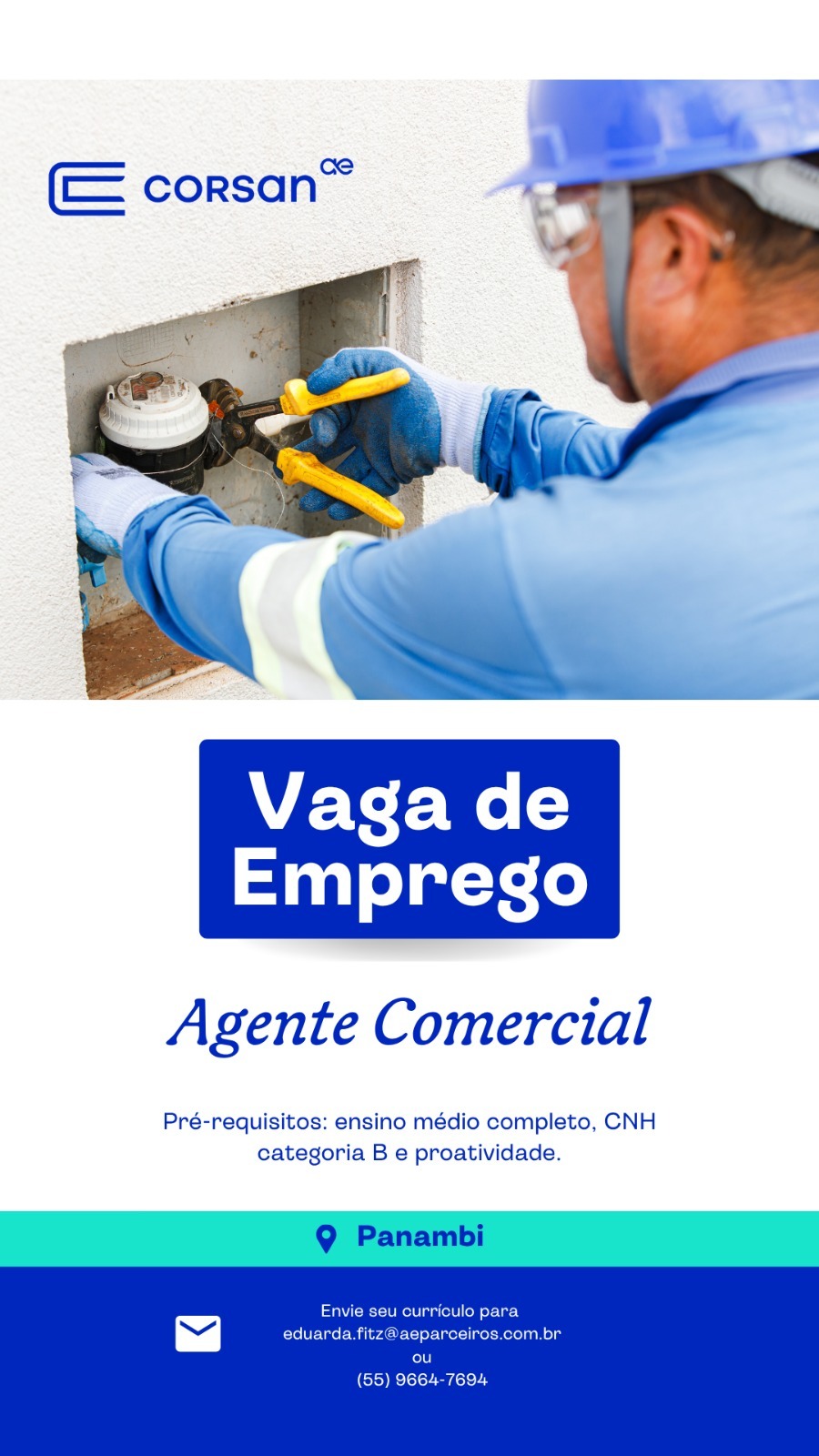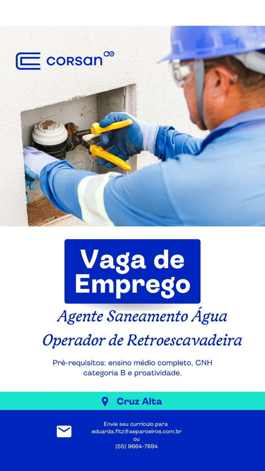 A Corsan tem vaga de trabalho para Ijuí. A oportunidade é para agente de saneamento de água. Em Panambi existe vaga para agente comercial e, Cruz Alta, vagas para agende de saneamento de água e operador de retroescavadeira. Em todos os casos, os candidatos precisam ter o ensino médio completo e CNH categoria B. Interessados precisam enviar currículo para o e-mail [email protected] ou para o whatsapp 55-99664-7694.