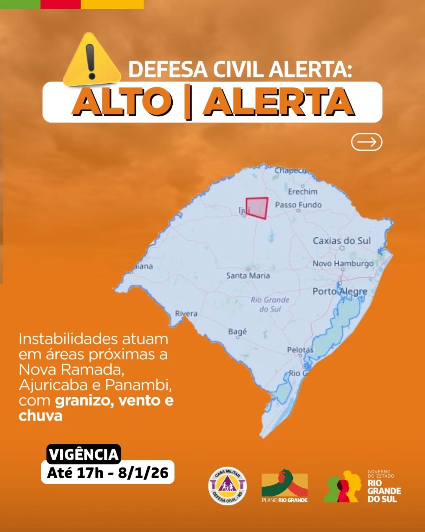 Defesa Civil alerta: Condição de ALERTA para instabilidades que atuam em áreas próximas a Nova Ramada, Ajuricaba e Panambi, com granizo, vento e chuva. Válido até 17h do dia 8 de janeiro. Risco ALTO de destelhamento. Evite áreas de risco. Emergência ligue 190/193.
