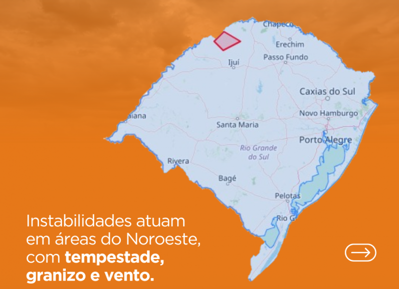 A Defesa Civil do Rio Grande do Sul emitiu um alerta laranja para condições de instabilidade na região Noroeste, com tempestade, granizo e vento. O alerta é válido até as 16h40 desta quinta-feira, e o risco de destelhamento é alto.